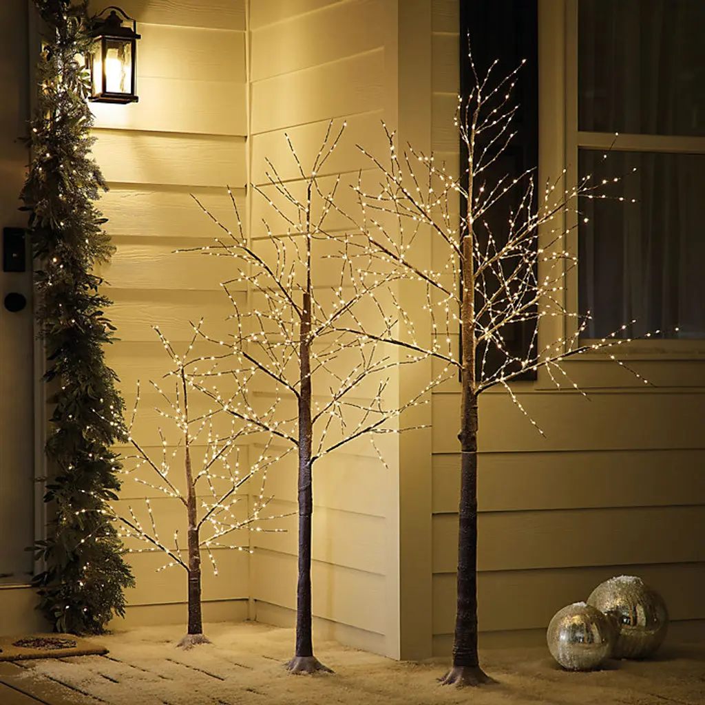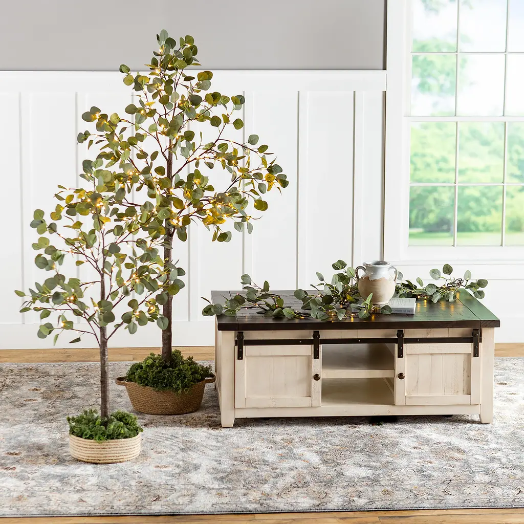Our beautiful, realistic Lighted Eucalyptus Tree goes indoors or out to add substance, style and sparkle anywhere. With its lifelike foliage and warm white LED lights, you can add a charming glow to your décor or landscape any time of year. The hallmark silvery-green leaves, crafted of fabric, have realistic veining and detail, bringing the look of nature to your home. It couldn't be easier: just plug in and enjoy! Posable branches are studded with warm white LED lights help you create a lovely display in no time. Each tree comes with a removable mounting base and four ground stakes to place on a floor, in a planter or stake in the ground. You can get creative and wrap the base with burlap or faux moss and place the tree in a pot or decorative container (not included). Each electric tree has a 16'L lead cord with all-weather, outdoor UL-approved adapter. Size is approximate. Wire and plastic construction for indoors or out. Easy assembly. Imported.