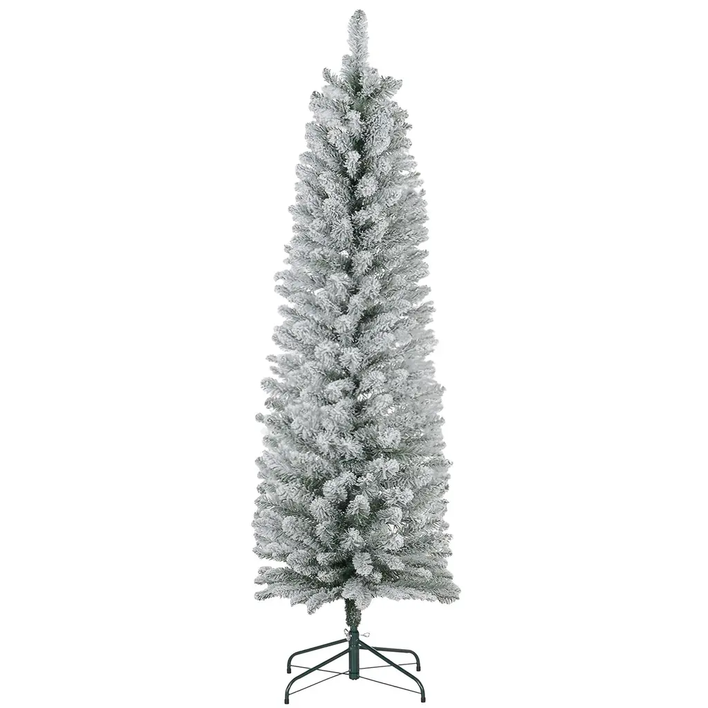 SpecificationsProduct FeaturesSnow-Kissed Splendor: Enjoy a white Christmas indoors with this flocked Christmas tree, featuring upward and downward branches for a realistic, festive look. The snow-dusted finish brings a touch of winter magic to your home, creating a beautiful holiday atmosphere.Space-Saving Design: Perfect for smaller spaces, this pencil Christmas tree fits effortlessly into tight corners, foyers, or apartments. Its slim profile allows you to enjoy festive cheer no matter the size of your room, making it an ideal second tree for added seasonal charm.Quick and Easy Setup: The simple sectioned design of this tree makes holiday decorating quick and hassle-free. Assembly takes only about 15 minutes, allowing you to focus more on enjoying the holiday season with loved ones.Safe for the Season: Celebrate with peace of mind knowing this artificial Christmas tree features flame-retardant branches. Supported by a sturdy metal base, the tree remains stable and secure, ensuring a safe and joyful holiday season.Bring the holiday spirit to your home with this beautiful snow-flocked pencil tree, offering a realistic look, space-saving design, and safe, easy setup for a stress-free Christmas season!