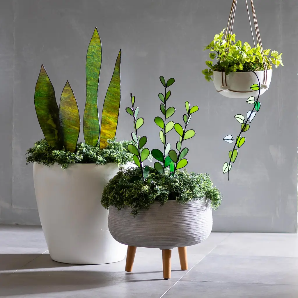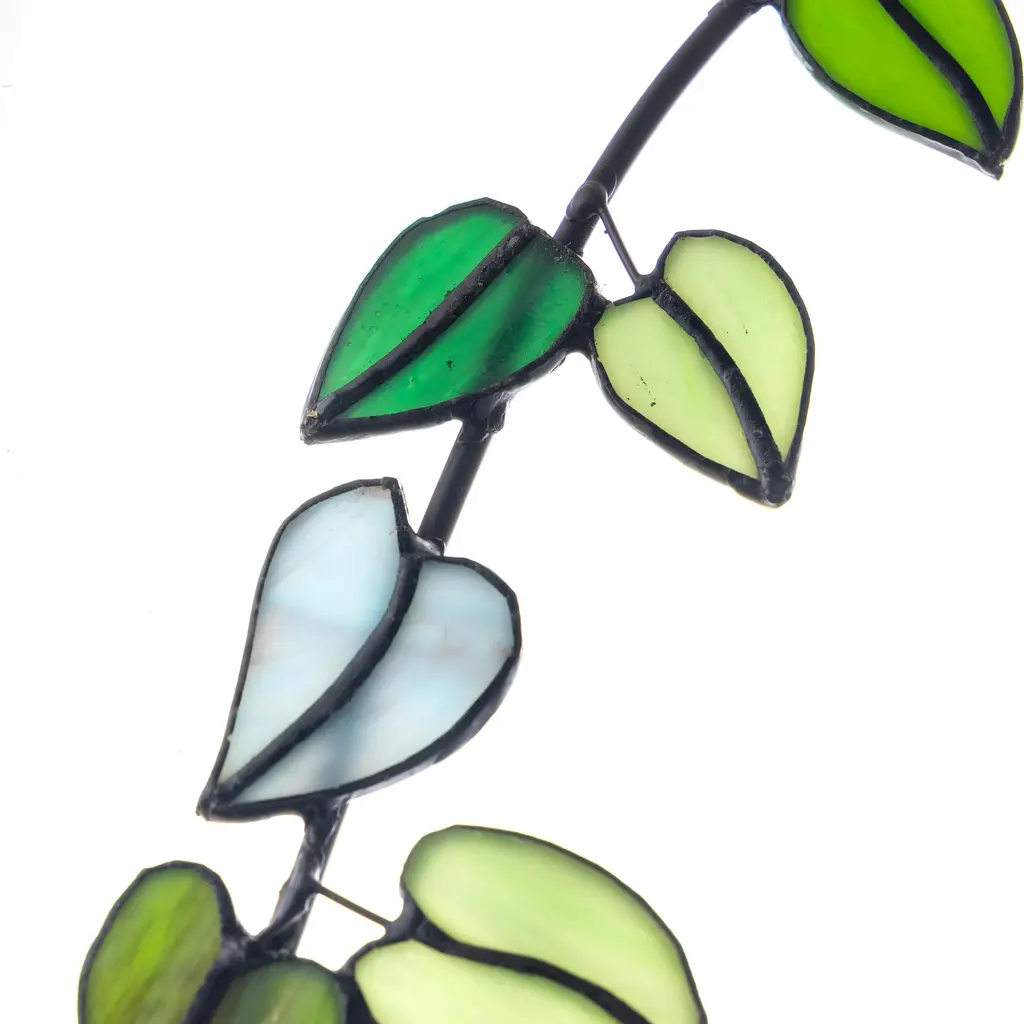 Exclusively designed, our Hanging Vine Stained Glass Leaf Stake adds bold, botanical flair to your indoor/ outdoor sanctuary. Crafted with intricate attention to detail, each piece in this collection features stunning stained glass plant leaves, capturing the essence of nature's beauty. These elegantly crafted stakes are designed to seamlessly integrate into your hanging planters, creating a captivating and conversation-worthy display.The brilliant green hues of the glass leaves shimmer in the sunlight, bringing a vibrant splash of color to your garden or patio. Perfect for those who appreciate the artistry of stained glass and the allure of nature, these stakes are a unique addition to any green space.