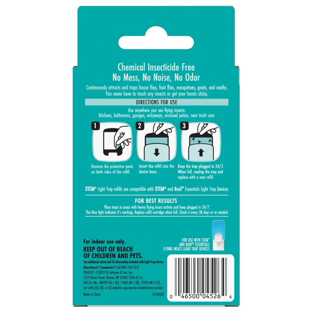 Use these refill cartridges for the STEM Flying Insect Light Trap, an easy, mess-free option for attracting and trapping a variety of flying insects like house flies, fruit flies, gnats, mosquitoes, and moths. Use this discreetly-designed flying insect trap in any indoor room where insects are present, especially around fruit, trash cans, garages and entryways. Enjoy the odor-free, soft blue light technology that traps insects with no chemical insecticides. We crafted our flying insect trap to be people, plant, and pet-friendly* for 24/7 continuous attraction. It’s easy to use and install. Simply remove protective peels, insert the dual-sided adhesive cartridge into the flying insect trap base, plug in to the wall, and position using the customizable 90-degree rotating plug and leave on 24/7. No need to touch any bugs or get your hands sticky. Replace the cartridge every month or when cartridge is full of bugs. *when used as directed