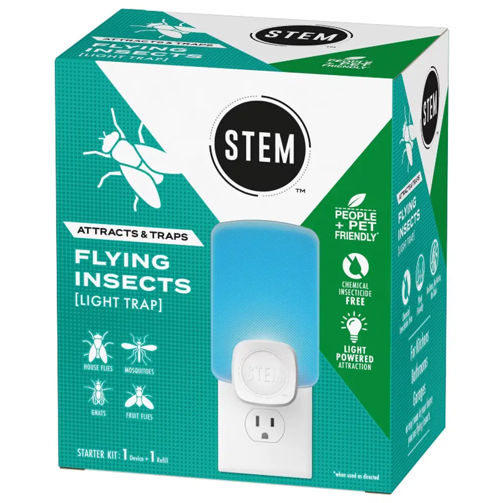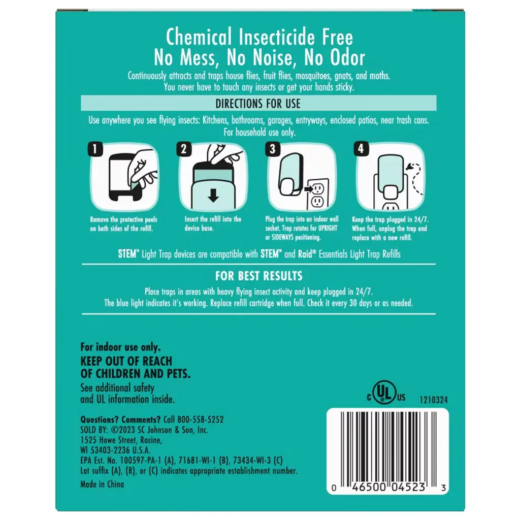 STEM Flying Insect Light Trap is an easy, mess-free option for attracting and trapping a variety of flying insects like house flies, fruit flies, gnats, mosquitoes, and moths. Use this discreetly-designed flying insect trap in any indoor room where insects are present, especially around fruit, trash cans, garages and entryways. Enjoy the odor-free, soft blue light technology that traps insects with no chemical insecticides. We crafted our moth and mosquito trap to be people, plant, and pet-friendly* for 24/7 continuous attraction. It’s easy to use and install. Simply remove protective peels, insert the dual-sided adhesive cartridge into the flying insect trap base, plug in to the wall, and position using the customizable 90-degree rotating plug and leave on 24/7. No need to touch any bugs or get your hands sticky. Replace the cartridge every month or when cartridge is full of bugs. This bug trap is compatible with Raid Essentials light trap refills as well. *when used as directed