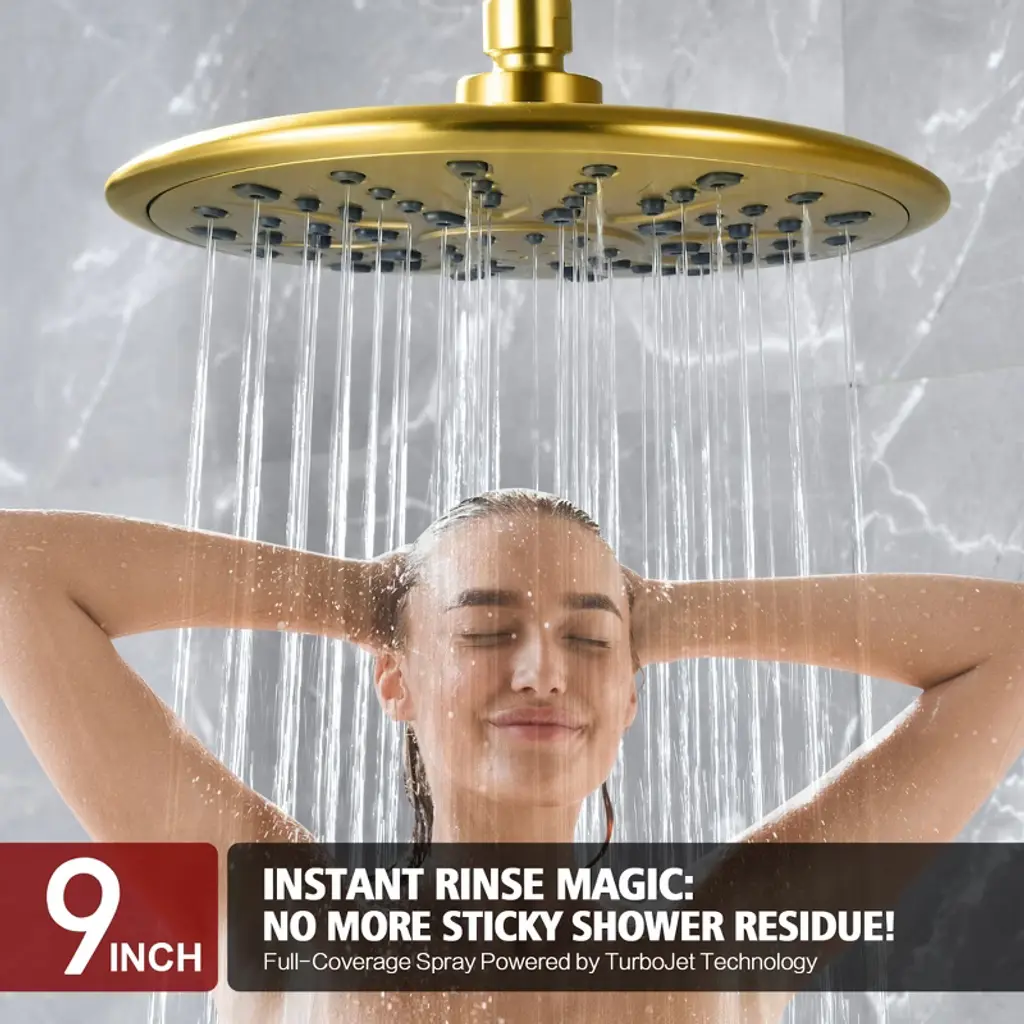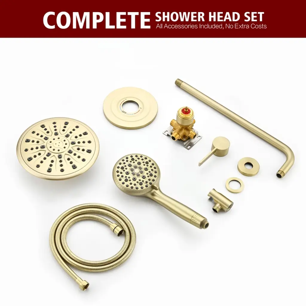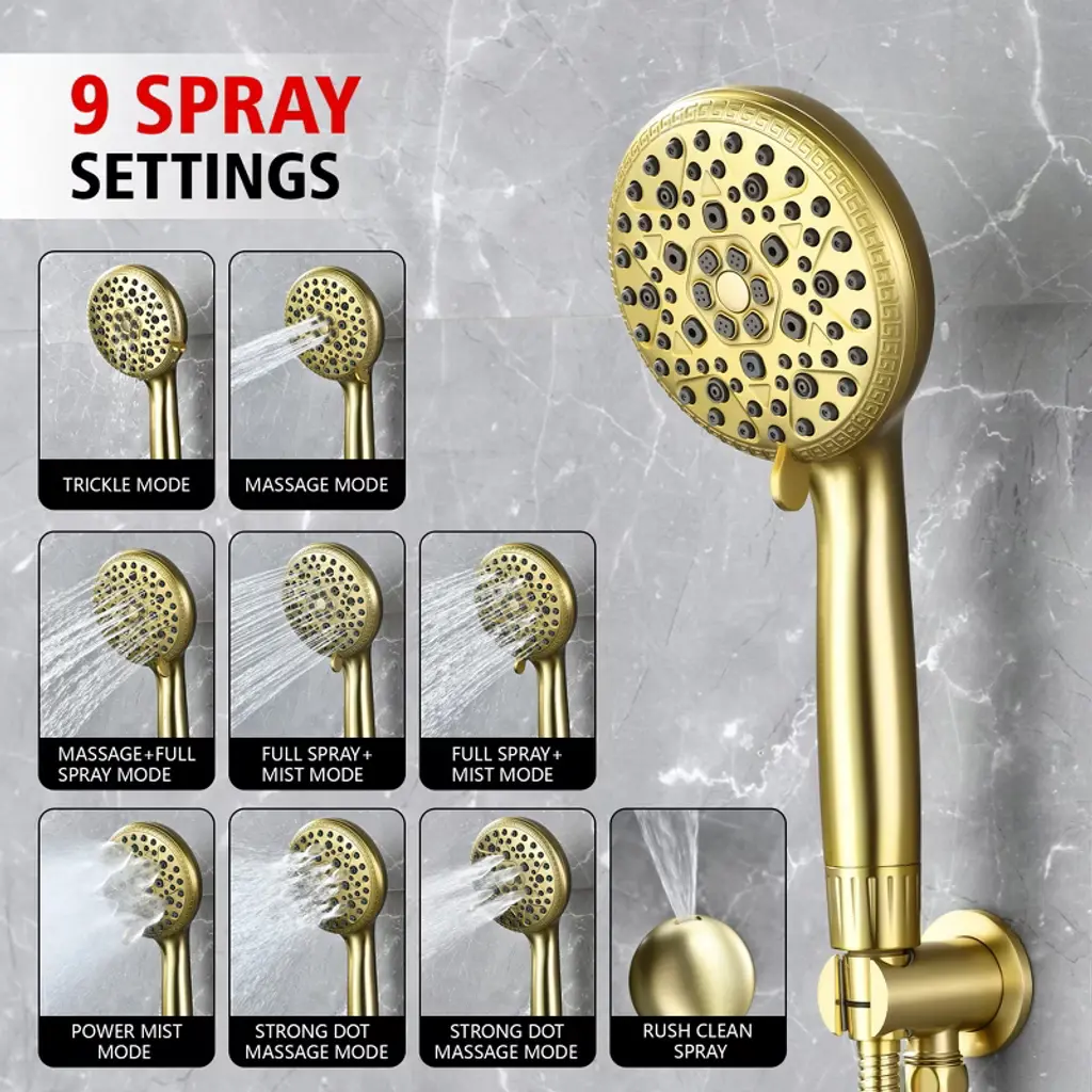 Transform your daily routine with this modern filtered shower system, designed for reliable performance. The 9-inch rainfall showerhead provides full-body coverage with 360°rotation adjustments, while the 9 settings spray filtered handheld shower (featuring Calcium Sulfite + KDF-55 + Vitamin C +FOF filters) helps reduce chlorine and scale buildup—suitable for various water conditions. Our dual-control brass valve ensures smooth transitions between shower modes, housed in a corrosion-resistant solid brass valve body built to last. The quick-release filter element (3-month/750-use lifespan) requires no tools for replacement, answering easy-maintenance shower demands. Includes all standard fittings and a hose for flexible installation. Model: S3244I-BG-TAProduct Name: Complete Shower System with Filter Hand ShowerMaterial: Brass+ABSFinish:Brushed Gold SUMERAIN is a established name in the US plumbing industry which puts great emphasis on stylish and durable. Perfection does not always have to be expensive. SUMERAIN masterful products are high quality and inexpensive. Over three decades of manufacturing experience has provided us with the extensive market knowledge and the ability to offer new products at reasonable expense. The key to our success is intelligentization- we have rapidly expanded into exciting new products groups to be at the forefront of the market. We are dedicated to bringing you the latest designs utilising the most up-to-date technology. The new product design team benefit from a development system audited to ISO9001 standards, meaning each product is designed, sourced, evaluated and warehoused in a high standard. About this item specificities 1. Advanced Filtered Shower System Filtered shower experience with our four-filter technology (Calcium Sulfite + KDF-55 +Vitamin C+FOF) that helps minimize certain substances, paired with vitamin C beads to addresses common water characteristics. Filter replacement is effortless—swap every 3 months or 750+ uses. 2. 9"""" Rainfall Showerhead with Full 360° Rotation Upgrade your bath experience with a modern 9-inch ceiling-mounted showerhead featuring seamless 360° rotation for customizable coverage. The luxury rainfall shower design delivers spa-like immersion, while durable brass construction ensures leak-proof performance.3. 9-Function Handheld Shower with Quick Rinse Mode Versatile handheld spray offers 9 settings including massage, mist, and a patented Rush Clean Spray function for pet bathing/cleaning. Filtered spray head combines practicality with user-friendly design.4. Dual-Control Valve & Premium Brass Build Simplify water flow adjustments with our user-friendly dual-function valve—seamlessly switch between overhead and handheld modes. Solid brass construction resists corrosion and cracks, aligning with durable shower set and leak-proof shower system searches.5. Modern Luxury Design for Elevated Bathrooms Sleek and minimalist lines create a contemporary luxury aesthetic. Compatible with most shower arms, this shower combo elevates master suites and guest baths.
