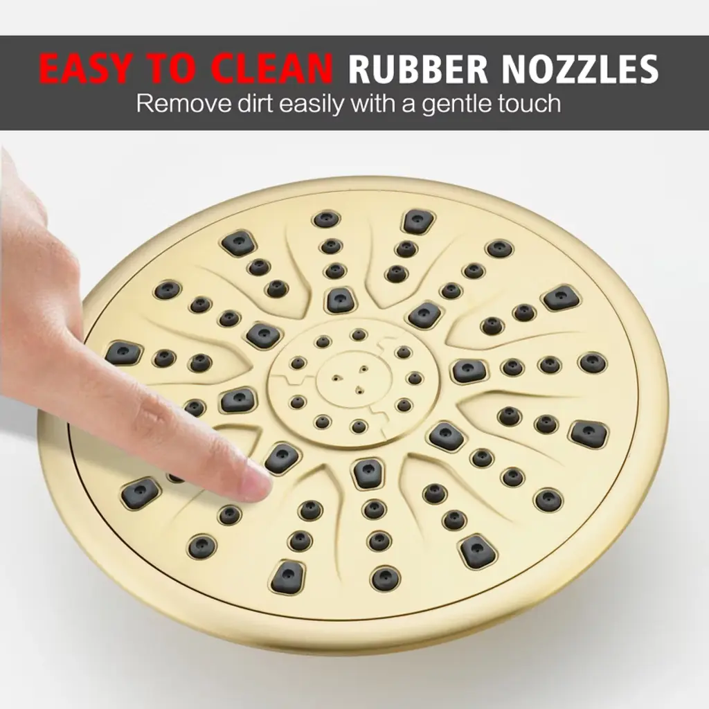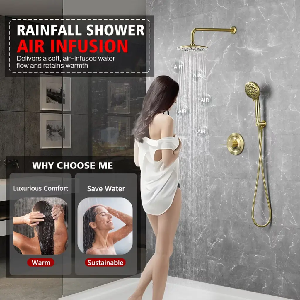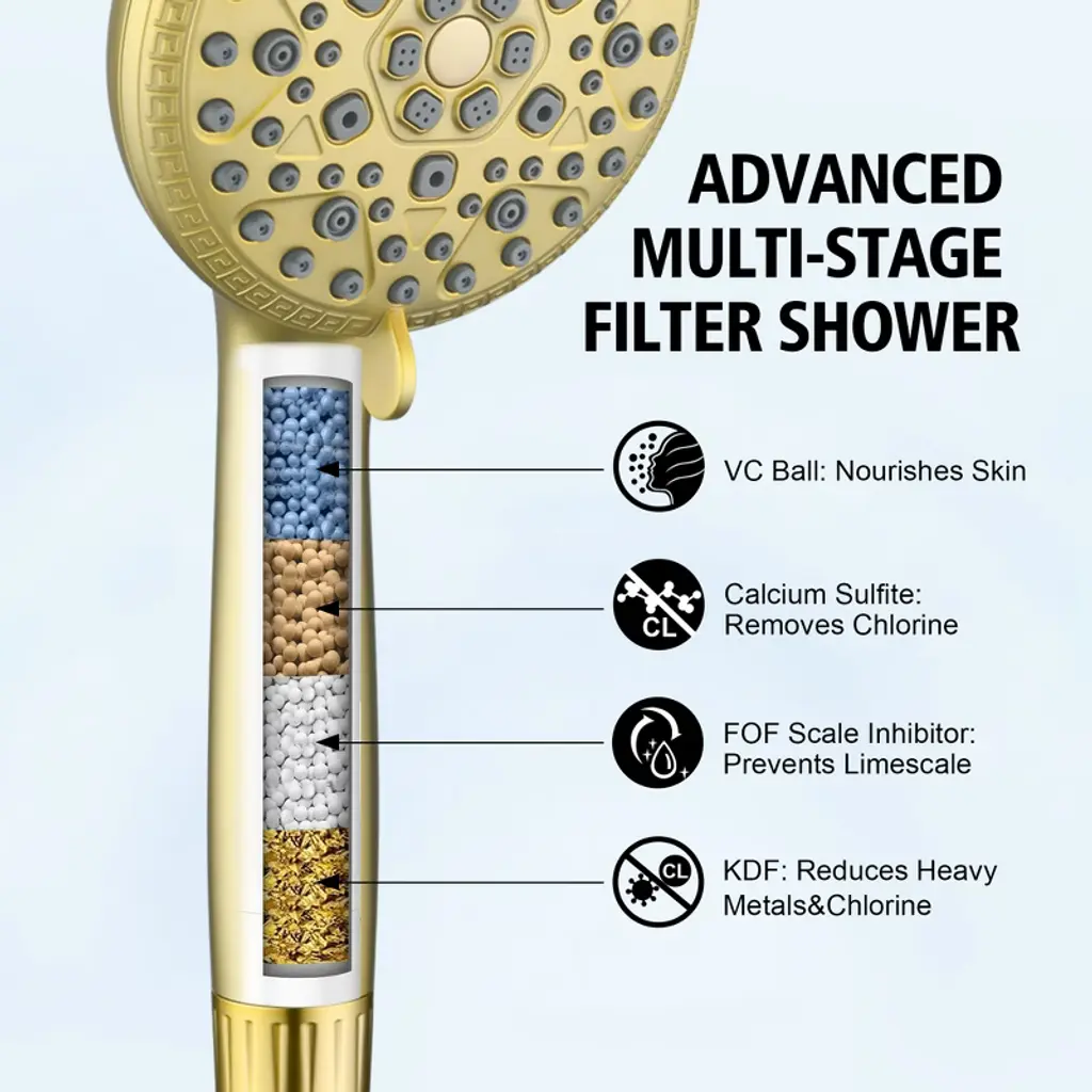 Transform your daily routine with this modern filtered shower system, designed for reliable performance. The 9-inch rainfall showerhead provides full-body coverage with 360°rotation adjustments, while the 9 settings spray filtered handheld shower (featuring Calcium Sulfite + KDF-55 + Vitamin C +FOF filters) helps reduce chlorine and scale buildup—suitable for various water conditions. Our dual-control brass valve ensures smooth transitions between shower modes, housed in a corrosion-resistant solid brass valve body built to last. The quick-release filter element (3-month/750-use lifespan) requires no tools for replacement, answering easy-maintenance shower demands. Includes all standard fittings and a hose for flexible installation. Model: S3244I-BG-TAProduct Name: Complete Shower System with Filter Hand ShowerMaterial: Brass+ABSFinish:Brushed Gold SUMERAIN is a established name in the US plumbing industry which puts great emphasis on stylish and durable. Perfection does not always have to be expensive. SUMERAIN masterful products are high quality and inexpensive. Over three decades of manufacturing experience has provided us with the extensive market knowledge and the ability to offer new products at reasonable expense. The key to our success is intelligentization- we have rapidly expanded into exciting new products groups to be at the forefront of the market. We are dedicated to bringing you the latest designs utilising the most up-to-date technology. The new product design team benefit from a development system audited to ISO9001 standards, meaning each product is designed, sourced, evaluated and warehoused in a high standard. About this item specificities 1. Advanced Filtered Shower System Filtered shower experience with our four-filter technology (Calcium Sulfite + KDF-55 +Vitamin C+FOF) that helps minimize certain substances, paired with vitamin C beads to addresses common water characteristics. Filter replacement is effortless—swap every 3 months or 750+ uses. 2. 9"""" Rainfall Showerhead with Full 360° Rotation Upgrade your bath experience with a modern 9-inch ceiling-mounted showerhead featuring seamless 360° rotation for customizable coverage. The luxury rainfall shower design delivers spa-like immersion, while durable brass construction ensures leak-proof performance.3. 9-Function Handheld Shower with Quick Rinse Mode Versatile handheld spray offers 9 settings including massage, mist, and a patented Rush Clean Spray function for pet bathing/cleaning. Filtered spray head combines practicality with user-friendly design.4. Dual-Control Valve & Premium Brass Build Simplify water flow adjustments with our user-friendly dual-function valve—seamlessly switch between overhead and handheld modes. Solid brass construction resists corrosion and cracks, aligning with durable shower set and leak-proof shower system searches.5. Modern Luxury Design for Elevated Bathrooms Sleek and minimalist lines create a contemporary luxury aesthetic. Compatible with most shower arms, this shower combo elevates master suites and guest baths.
