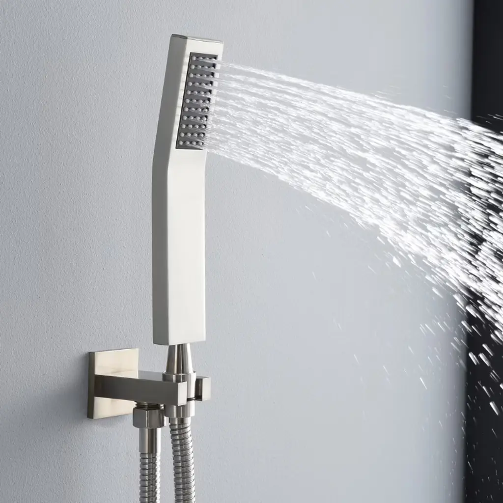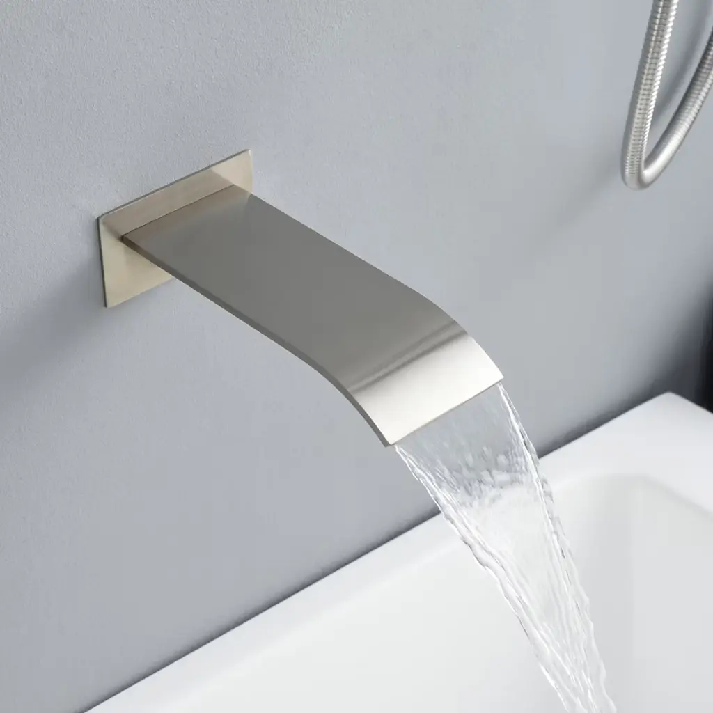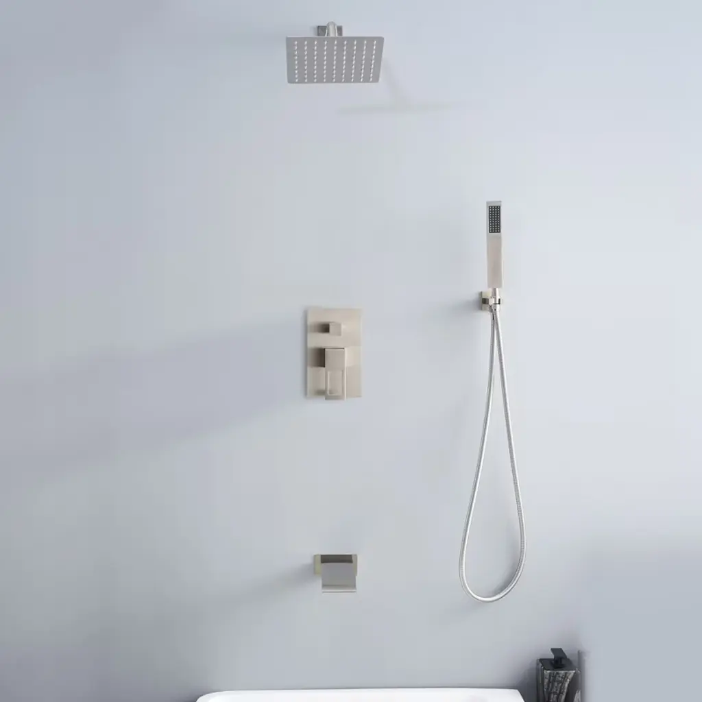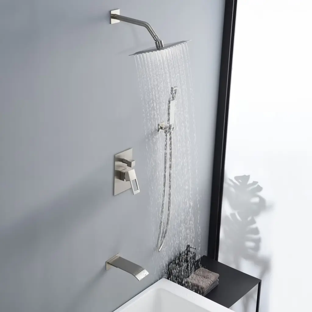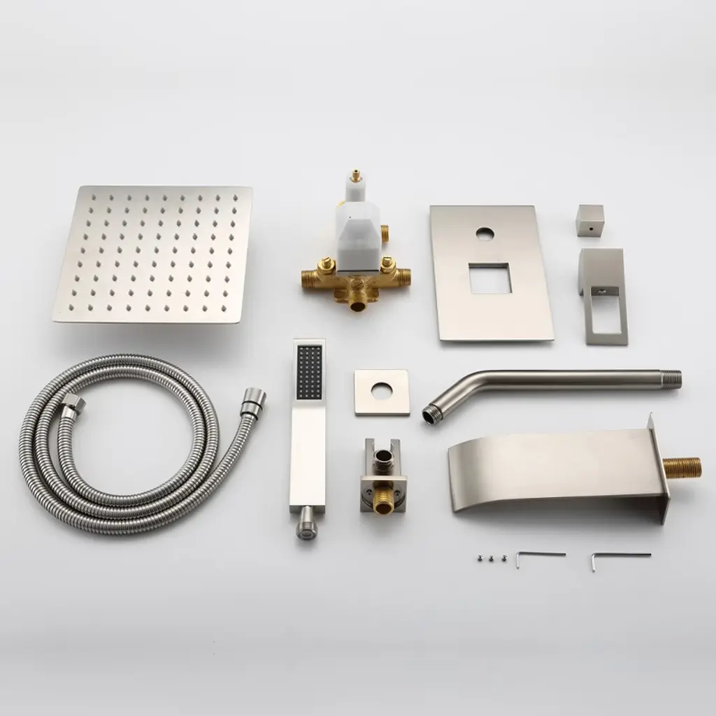 Transform your bathroom into a modern masterpiece with this sumerain tub and shower system! A C-UPC certificated pressure balancing rough-in valve prevents scalding while maintaining your desired temperature and compensating for pressure fluctuation.The wide waterfall spout with large water flow (4.17GPM at 60PSI)to quickly fill your bathtub.The flexible hand shower allows you to take care of every inch of the body and bathes your children and pets with great convenience. High pressure ultra-thin rain shower head and hand wand with easy clean spray holes allow you to easily wipe away calcium and lime build-up with the touch of a finger.Standard US NPT 1/2" connector is compatible with most existing shower systems' pipes.A perfect addition to your bathroom! 1.8GPM(6.8L/MIN)showerhead and hand shower flow rate,product listed in the CEC modernized appliance efficiency database system and DOE list, It has WaterSense certification and compliant with standard: EPA WaterSense specification for showerheads(version 1.1,July 26,2018). This tub and shower system also has ICC-ES PMG certification and is compliant with standard: ASME A112.18.1/CSA B125.1-2018, plumbing supply fittings(the same standard as cUPC certification). Model: S3233NW-B-TAProduct Name: Rain Shower SystemMaterial: Brass, Stainless SteelFinish: Brushed NickelPressure Balance Rough-in Valve SUMERAIN is a established name in the US plumbing industry which puts great emphasis on stylish and durable. Perfection does not always have to be expensive. SUMERAIN masterful products are high quality and inexpensive. Over three decades of manufacturing experience has provided us with the extensive market knowledge and the ability to offer new products at reasonable expense. The key to our success is intelligentization- we have rapidly expanded into exciting new products groups to be at the forefront of the market. We are dedicated to bringing you the latest designs utilising the most up-to-date technology. The new product design team benefit from a development system audited to ISO9001 standards, meaning each product is designed, sourced, evaluated and warehoused in a high standard. About this item specificities 1. With the thickened solid brass cast valve and anti-scalding pressure balance cartridge, this tub shower faucet especially designed for American users>2. The tub and shower system includes: square rain shower, handheld shower head, shower arm, shower hose,shower elbow with holder, shower mixer control valve, tub spout. Trim and all parts of this tub faucet set are constructed of metal, ensures durability and providing aesthetic appeal.3. This shower system has three modes: waterfall tub spout, rain shower head and hand wand, which could easily switch by turning the square knob on the valve. The lever handle easily adjust the hot/cold water flow and temperature.This shower set features a wide waterfall spout with large water flow (4.17GPM at 60PSI)to quickly fill your bathtub.4. The American standard NPT1/2 connector is compatible with most existing shower systems' pipes,for saving man-hour cost during installing.5. Even at low water flow, the use of ultra-thin rain shower head offers high water pressure. Rain shower head and hand wand with touch clean soft, rubber nubbins (spray holes) that allow you to easily wipe away calcium and lime build-up with the touch of a finger. This is particularly helpful for areas with hard water.