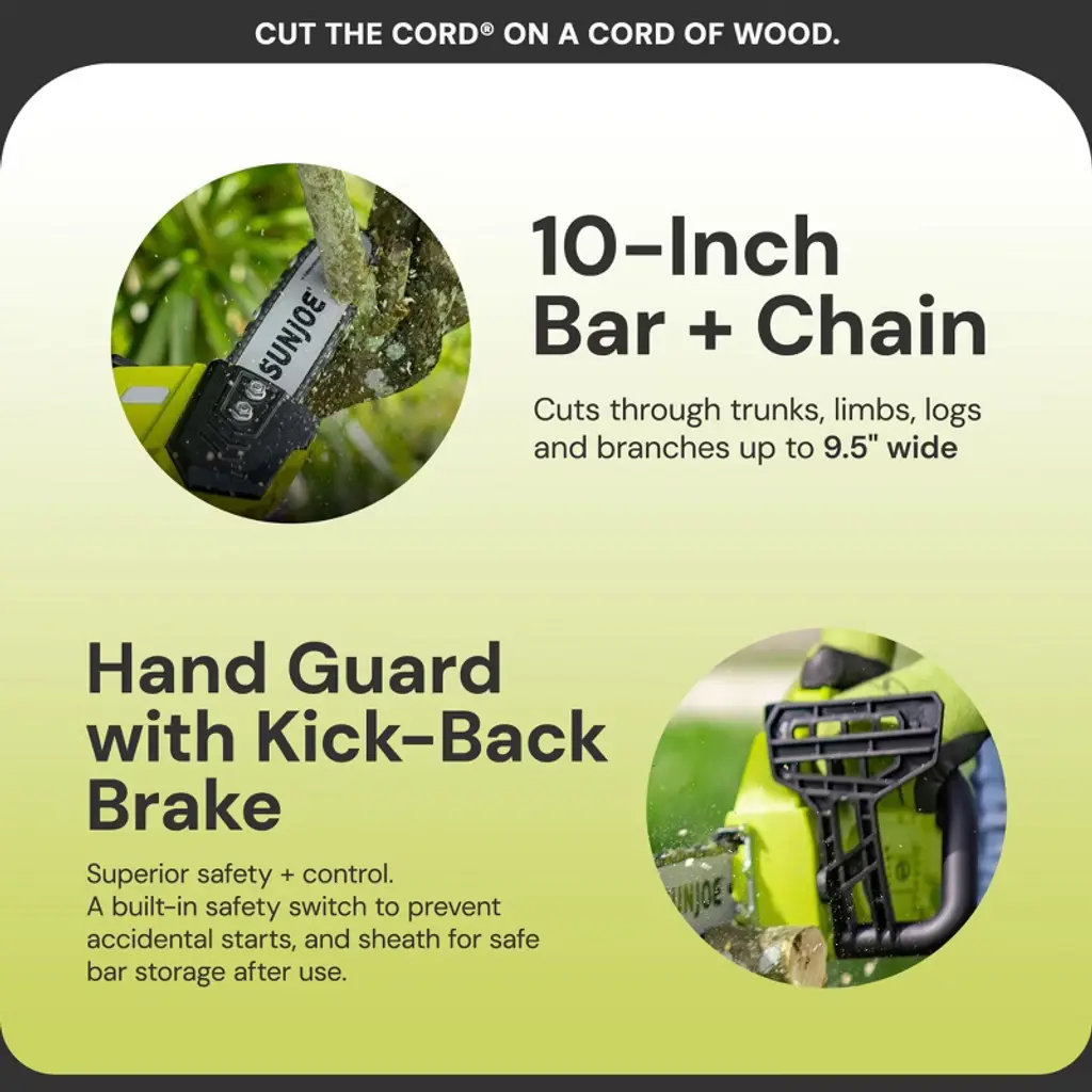 Sun Joe 10" Cordless Chain Saw, 24v Tree Trunks And Log Cutting Tool Kit With Battery And Charger For Branches Up To 9.5" Thick, 24v-10cs