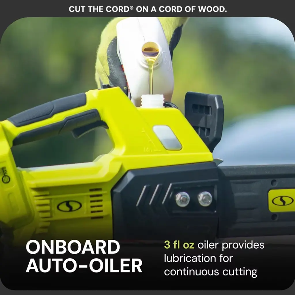 Bid farewell to the limitations of power cords and embrace the freedom of cordless tree trimming with the Sun Joe 10-Inch Cordless Chain Saw. This powerful and versatile tool is designed to tackle your toughest outdoor tasks, from cutting through thick tree trunks and limbs to clearing away dense brush and dead branches. Powered by Sun Joe's exclusive IONMAX system and a 24-volt, 4.0 Ah lithium-ion battery, this chain saw delivers up to 12 minutes of runtime and can make up to 74 cuts on a single charge. The robust 600-watt motor and 10-inch bar and chain effortlessly slice through wood up to 9.5 inches thick, allowing you to efficiently tackle a wide range of projects. Say goodbye to the hassle of gas-powered chainsaws and the constraints of extension cords. This Cordless Chain Saw is lightweight, weighing less than 8.5 pounds, making it easy to maneuver and transport to wherever the work needs to be done. The onboard 3-fluid-ounce auto-oiler keeps the bar and chain lubricated, ensuring continuous, smooth cutting performance. This Chain Saw Kit features a built-in hand guard with a kickback brake, a safety switch to prevent accidental starts, and a sheath for safe bar storage when the job is done. These features provide superior control and protection, giving you the confidence to tackle your outdoor projects with ease. Elevate your tree-trimming game with the Sun Joe 10-Inch Cordless Chain Saw. Powered by the latest in lithium-ion battery technology and engineered for maximum performance, this tool is the perfect companion for homeowners, landscapers, and outdoor enthusiasts who demand the best.