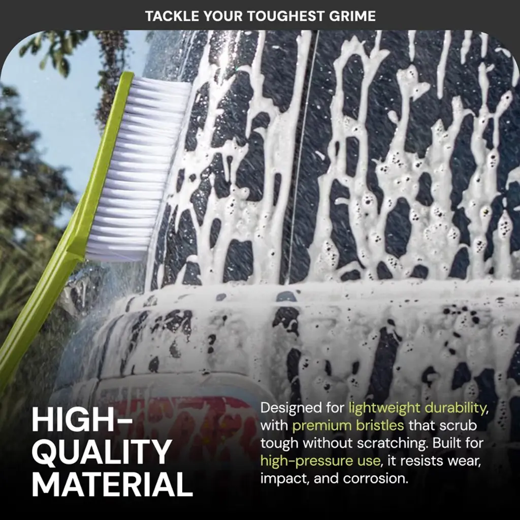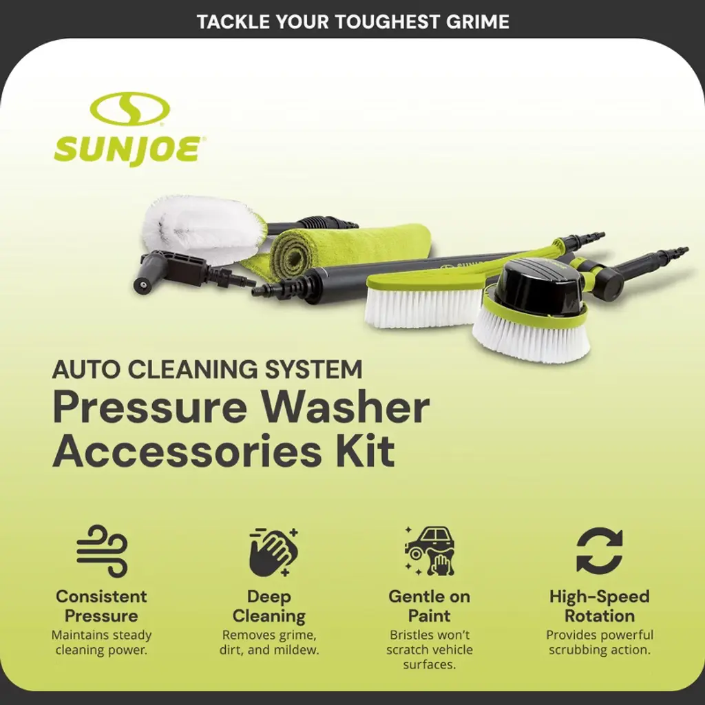 Unlock the full potential of your pressure washer with the Sun Joe Auto Cleaning System a comprehensive solution designed to tackle even the toughest grime and leave your vehicle sparkling. This versatile kit comes packed with a suite of specialized tools to help you achieve a showroom-worthy finish, no matter the cleaning challenge. At the heart of the system is the Rotary Wash Brush, a 5.7-inch diameter brush with a 0° to 180° adjustable head that spins away stubborn dirt, debris, and grime with ease. The Utility Bristle Brush, with its durable and feathered bristles, provides a gentle yet effective scrubbing action to tackle delicate surfaces without causing any damage. For those hard-to-reach areas, the Turbo Nozzle and 20-inch Extension Rod are a game-changer. The 90-degree angled nozzle allows you to clean under your car, in wheel wells, and other tight spaces with precision, while the telescoping rod extends your reach for a thorough, top-to-bottom clean. Stubborn road grime on your tires and rims? The Wheel and Rim Brush, with its fine bristles, is specifically designed to scrub away that tough residue, leaving your wheels sparkling. But the Sun Joe Auto Cleaning System is more than just a collection of tools - it's a complete cleaning solution. Included in the kit is a high-quality microfiber cloth, perfect for drying and polishing your vehicle without leaving any streaks or scratches. Compatibility is key, and this system is built to work seamlessly with most pressure washers up to 3500 PSI, thanks to the included universal adapters. Whether you're tackling your daily driver or prepping a show car, the Sun Joe Auto Cleaning System has you covered. Elevate your car-washing experience and achieve a professional-grade shine with the Sun Joe Auto Cleaning System. Tackle your toughest grime, reach every nook and cranny, and leave your vehicle looking its absolute best. Get equipped and get cleaning with Sun Joe.