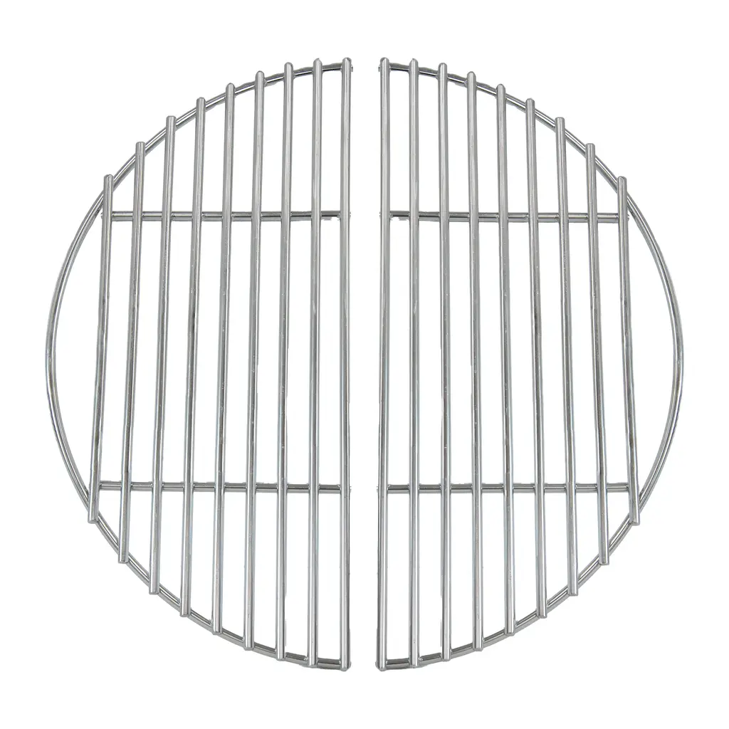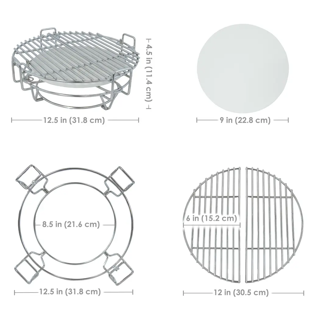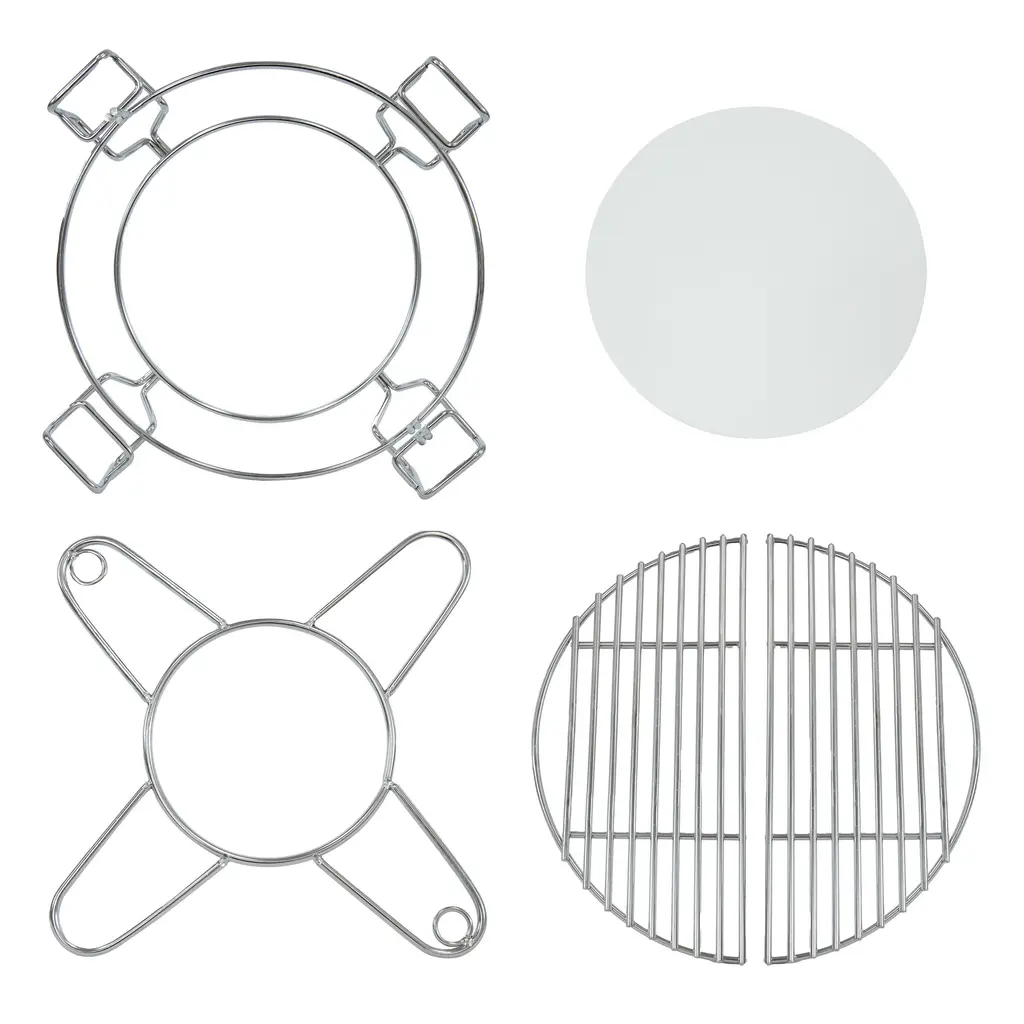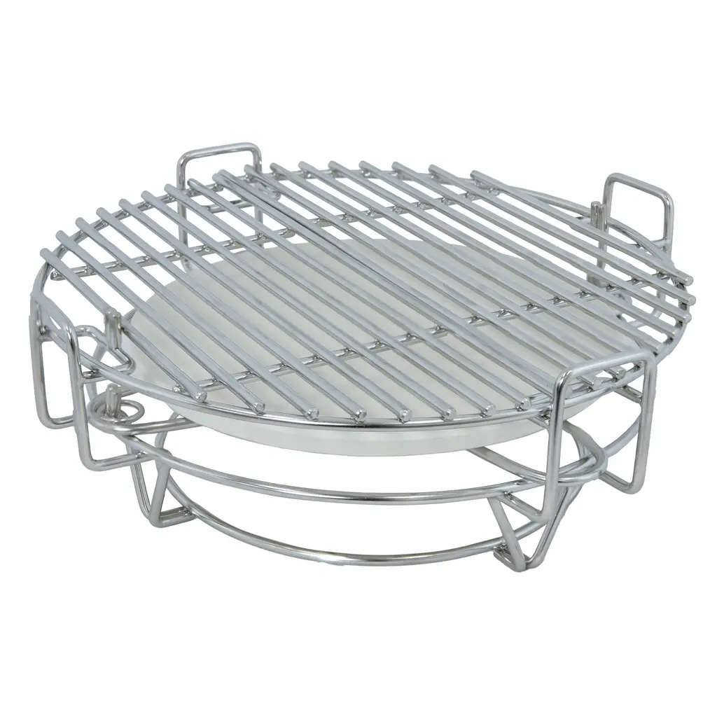 SKU: APX-4901 Enhance the experience of grilling on a kamado with the half moon flexible cooking system. This innovative system features a stainless steel cooking grate, offering exceptional durability and resistance to rust and corrosion. The grate conveniently splits into two pieces, providing versatile cooking configurations and ease of handling and cleaning. The ceramic deflector plate ensures consistent heat distribution and allows the creation of two cooking zones. This design enables seamless switching between direct and indirect cooking methods. On one side of the grill, sear steaks to a flawless finish, while on the other, slow-cook or smoke delicate foods to achieve exceptional tenderness and flavor. The ceramic material maintains even heat retention, preventing hot spots and enhancing the overall taste of dishes. The stainless steel cooking grate expands grilling capabilities and simplifies the cooking process. A great tool for both seasoned grill masters and weekend BBQ enthusiasts, this system combines convenience, versatility, and outstanding performance in outdoor cooking. Features: Additional Details: The digital images we display have the most accurate color possible. However, due to differences in computer monitors, we cannot be responsible for variations in color between the actual product and your screen.