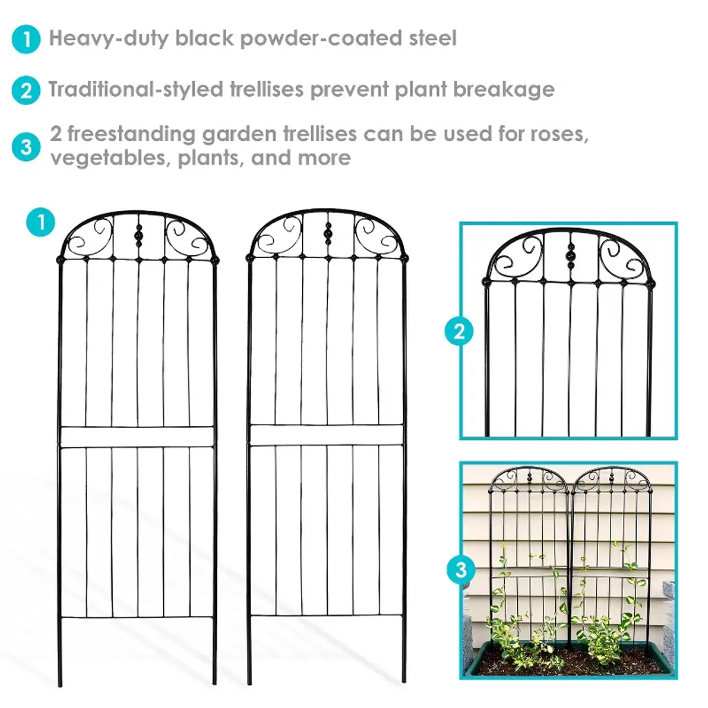 Protect and support budding plants, flowers, and crops with more than just a standard care routine with this traditional, metal plant trellis cage. This flower trellis can be used indoors or outdoors to protect all plants and can be used with large potted plants as well. Made from steel, these thick wire structures feature a 2-piece assembly (with all the hardware and instructions needed included) and are powder coated for design and further durability purposes. The steel construction makes these rose bush great for outdoor use as they are weather resistant, rust resistant, and strong! This traditional style is simple yet elegant and would look beautiful against garden pastures, in potted plants, or up against a wall in the yard or garden. Prevent plant breakage, premature falling fruit or vegetables, and wandering foragers, all while promoting healthy growth with style and ease.• GREAT SIZE FOR CLIMBING PLANTS: Each metal trellis panel measures 32 inches long x 10.6 inches wide and weighs approximately 2 pounds, so they are an easy addition to any garden or large potted plant. The in-ground height is 27 inches tall.• DECORATIVE AND DURABLE: Featuring a 2-piece assembly, these garden trellises for climbing plants are constructed of 0.25" thick heavy-duty black powder-coated steel wire for longevity and weather resistance.• PREMIUM PLANT SUPPORT: These traditional-style metal garden trellises prevent plant breakage and premature falling fruit/vegetables while promoting healthy growth.• VERSATILE OPTIONS: Includes 2 plant climbing support trellises that can be used for grapevines, roses, vegetables, plants, and much more. Place them outside on the patio, lawn, deck, front porch, balcony, or yard.• WORRY-FREE PURCHASING: Sunnydaze Decor backs its products with a 1-year manufacturer's warranty.