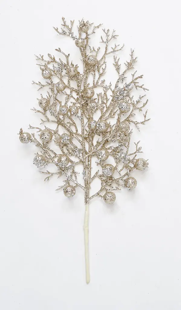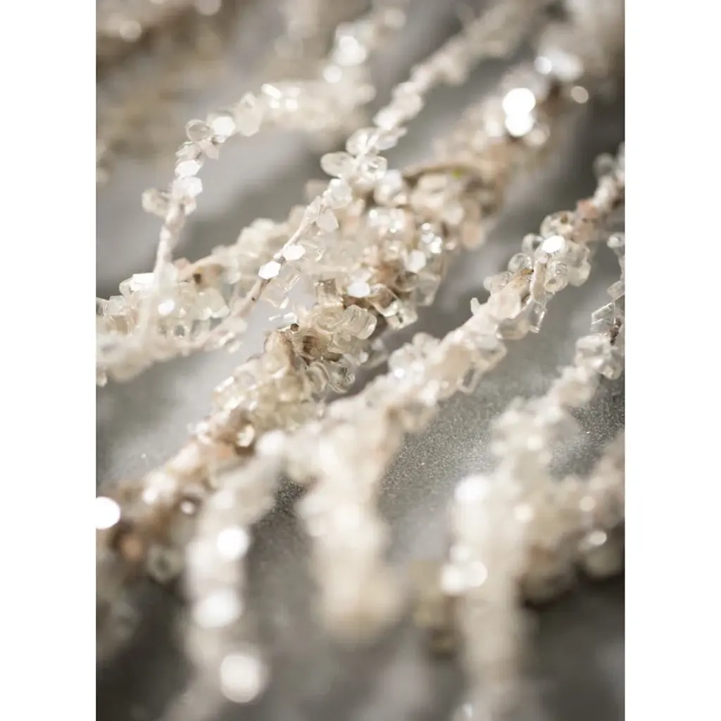 Fully covered in crystal faceted beads, this iced birch spray is plastic and extremely durable. It stands tall and encompasses a bundle of wavy twigs into one amazing piece.
