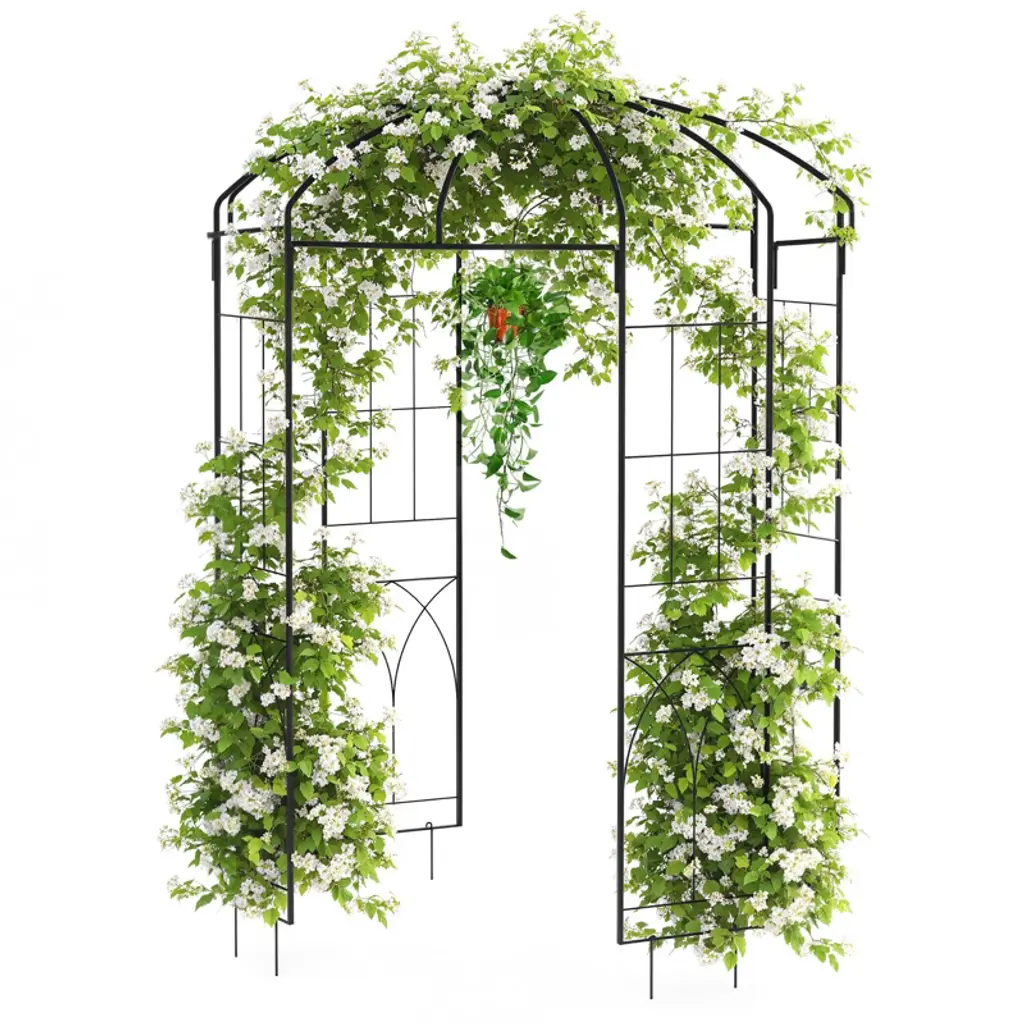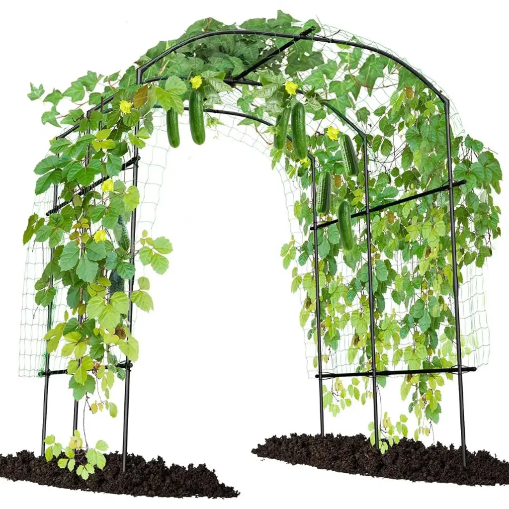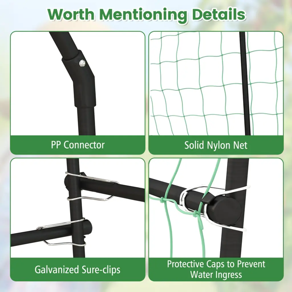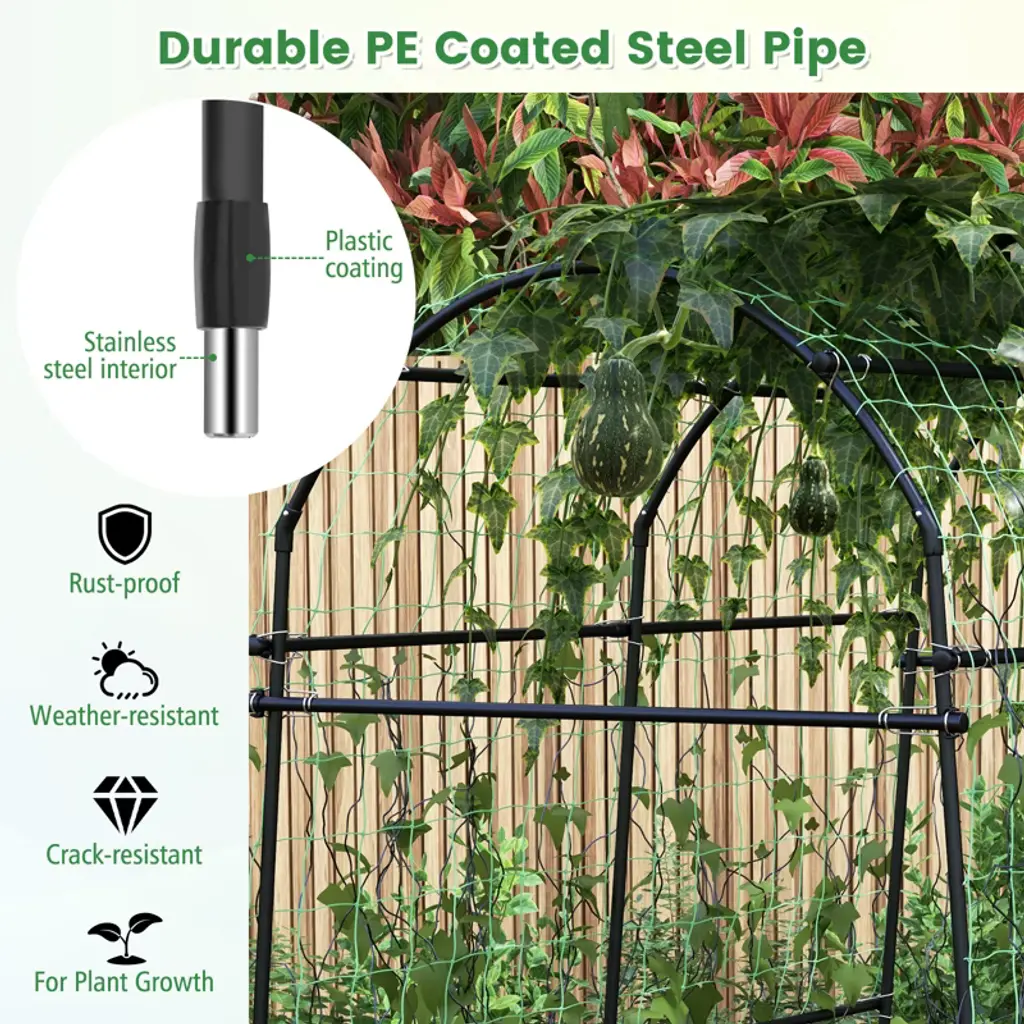 Our 7.5FT garden arch trellis is a great helper to make full use of the vertical space in the garden for plant growth! It gives more space for climbing plants to grow, and the fruits leave the ground as they grow without rotten. The garden trellis arch boasts metal inner core with plastic coating, which is weatherproof, anti-rust, and long-lasting for a long lifespan. Protective caps, PP connectors, and galvanized sure clips are provided to ensure that the assembled trellis is strong enough to be used safely in your vegetable garden. Convenient rotation hole rod can be used to turn holes for seeding or to insert foot tubes. You can plant your favorite climbing plants or flowers and use it as a beautiful garden arbor. It is easy to disassemble and store these tunnel trellis for your next year's use.Features7.5ft large arch trellis is suitable for most climbing vegetables and fruitsMade of high-quality metal tube core and thickened PE shellUpgraded anti-rust technology makes the metal tubes waterproof & anti-rustGalvanized sure-clips and strong nylon net ensure higher load-bearingRotation Hole Rod can turn holes for seeding or to insert foot tubesMetal pipes are equipped with waterproof caps to prolong the lifespanEasy assembly is guaranteed with assembly video and clear instructionSpecifications: Frame Color: Black Net Color Green Material: PP + Nylon + Metal Product Dimension: 71" x 43-63" x 90"(W x D x H) Net Weight: 15 lbs Maximum Weight: 75 lbs Package includes: 1 x Garden Arch Trellis 1 x Rotating Hole Rod 1 x Instruction