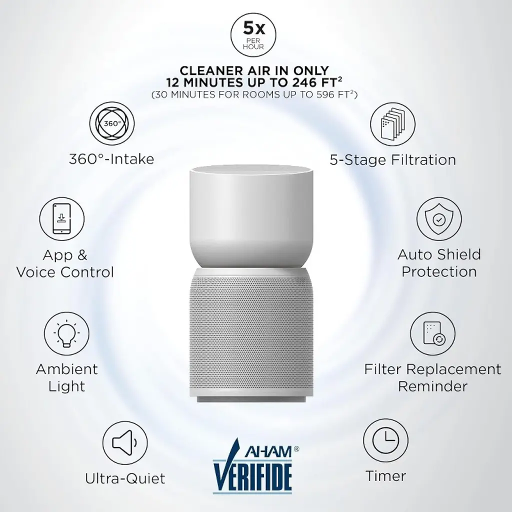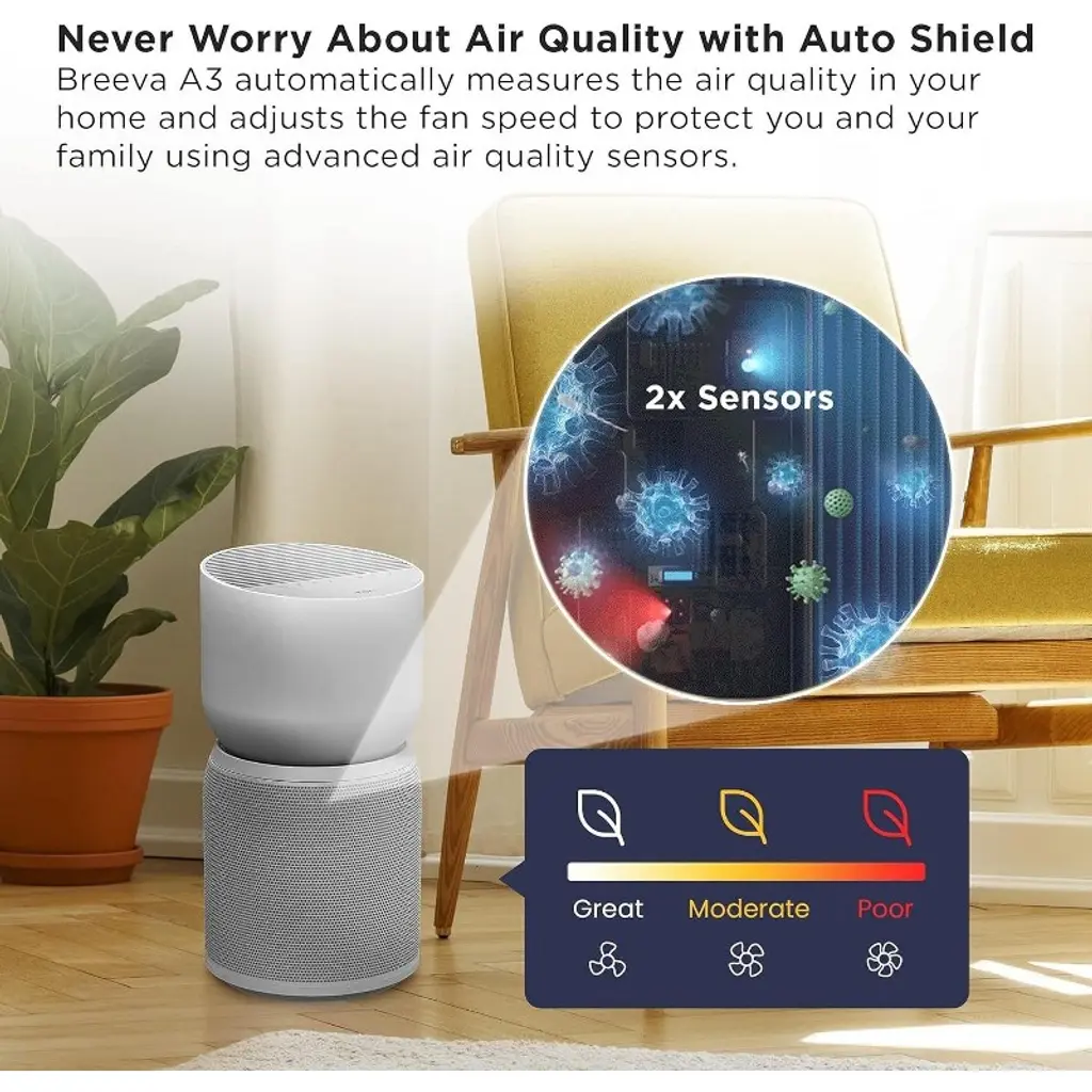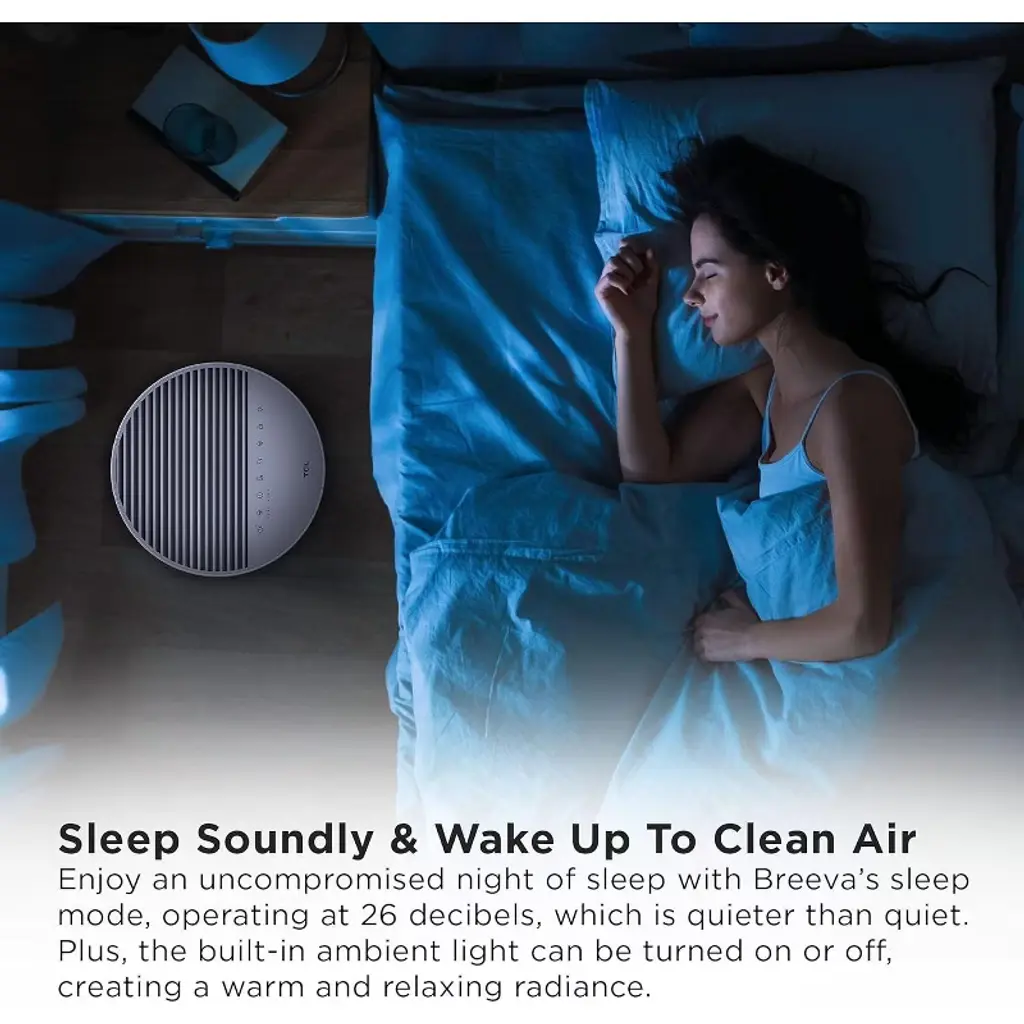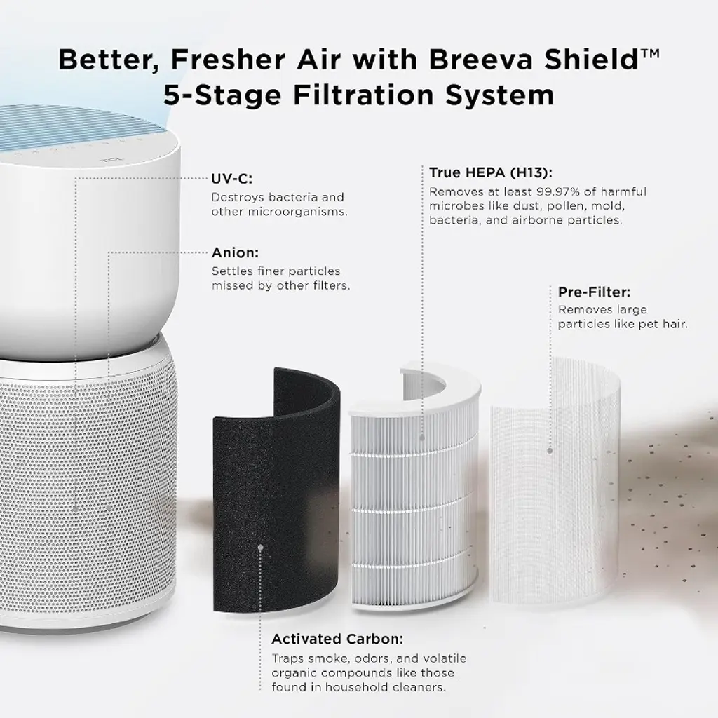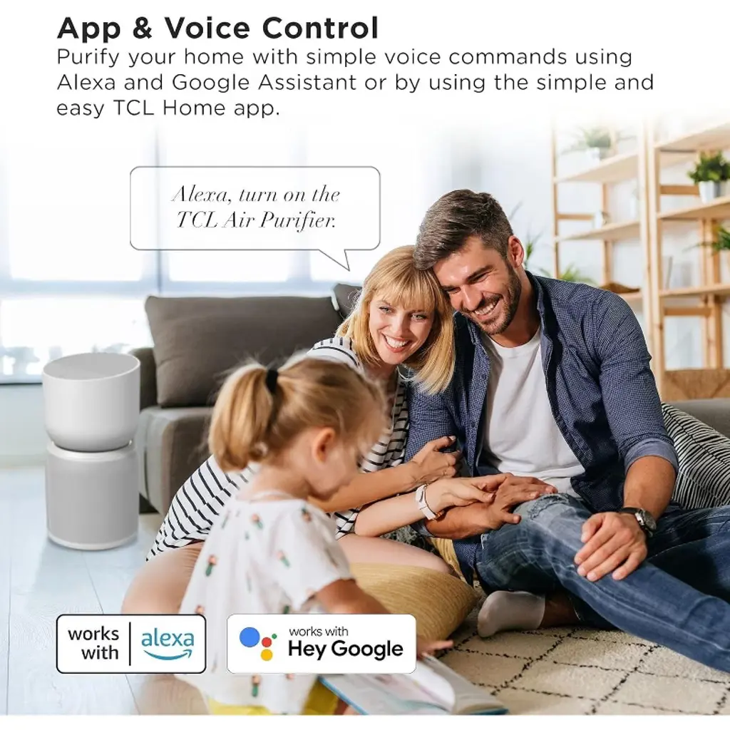 TCL Breeva Air Purifiers are so powerful that they create cleaner and fresher air in as little as 12 minutes! * The 360-degree in-take and effective room circulation makes the Breeva Air Purifier perfect for rooms 246 sq. ft² up to 1230 ft² in 60 minutes. EANER AIR IN ONLY 12 MINUTES: Your Breeva Air Purifier takes only 12 minutes to filter your entire room (5X every hour), eliminating lingering pet odors, allergens, and more. *BREEVA SHIELD PLUS 5-STAGE FILTRATION SYSTEM: Features a pre-filter, True HEPA (H13), activated carbon filter, anion technology, and UV-C sterilization technology that eliminates 99.97% of dust, pollen, mold, bacteria, and other airborne particles as well as absorbs odor, smoke, and volatile organic compounds that can be found in household cleaning supplies. (Filter Life 3-6 months)^360-DEGREE CLEAN: The sleek designed tower provides 360-degree air intake and propels clean, fresh air throughout your room. Perfect for rooms from 246 sq. ft. up to 1230 sq. ft.†NEVER WORRY ABOUT AIR QUALITY AGAIN: Auto Shield mode automatically measures the air quality in your home and adjusts the fan speed to protect you and your family using a sophisticated air quality detection system for improved accuracy.VOICE CONTROL READY: Link your Breeva to your Alexa or Google Assistant devices to easily control your device using only your voice.ADVANCED CONTROLS FROM YOUR SMARTPHONE: The user-friendly app allows you to control your air purifier from anywhere, right from your smartphone. Check the air purifier status, view air quality history, change fan speeds, control ambient lighting, and more.SLEEP SOUNDLY, WAKE UP REFRESHED: Enjoy a peaceful, full night of sleep with Breeva's sleep mode, which operates a level quieter than a whisper allowing you to sleep soundly and wake up to clean, fresh air.CLEAN AIR ON YOUR TIME: The Breeva Air Purifier is built with simplicity in mind. Users can set the Breeva to turn off in 1, 2, 4, and 8-hour intervals using the Timer feature.ADDITIONAL FEATURES: No need to guess when to change your filter. Your Breeva air filter notifies you of your filter's status using LED indicators. Also, the panel lock feature ensures that no child or furry friend accidentally changes your settings.MODERN DÉCOR: TCL's line of Breeva Air Purifiers adds a sleek and alluring element of design that will fit in with any home décor