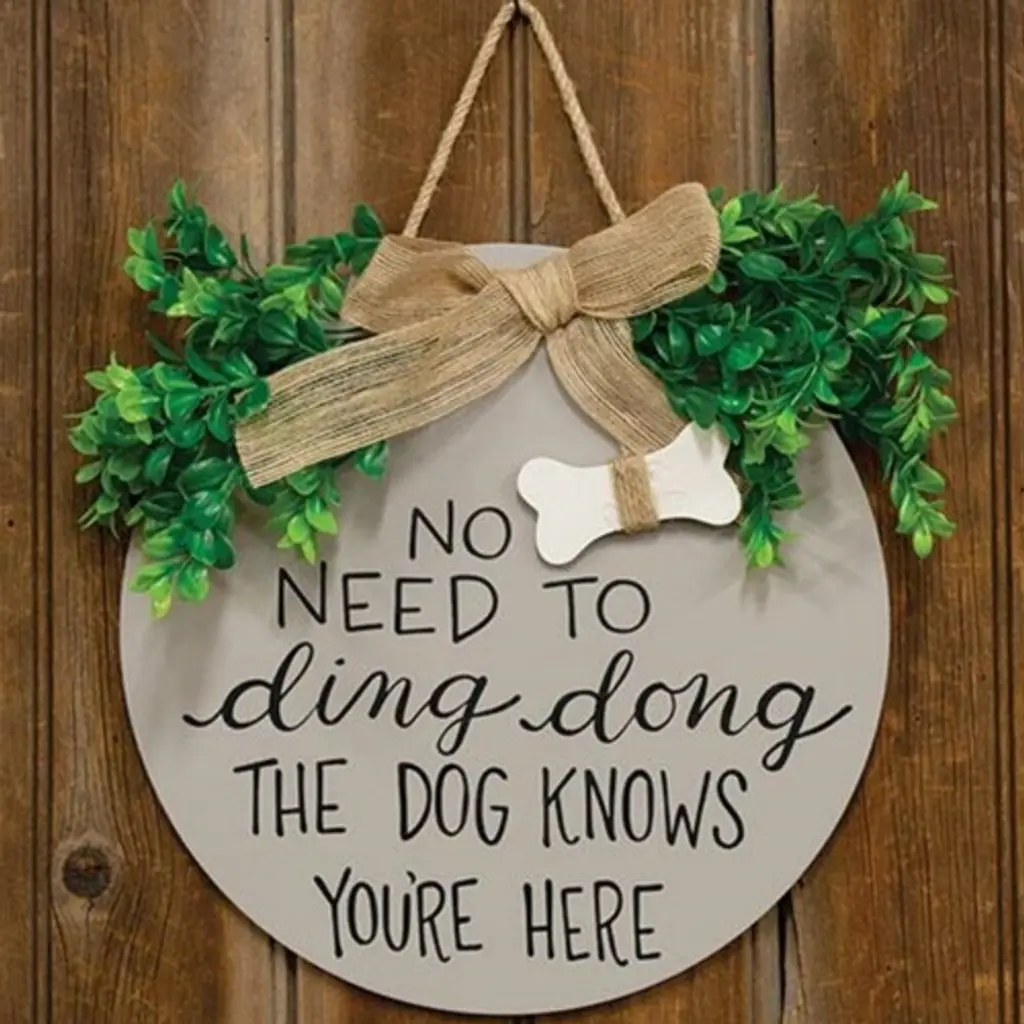 Description:The Dog Round Sign is a flat, round wooden sign that comes in a soft taupe-gray color. The sign reads “No need to ding dong the dog knows you’re here” in black script and is decorated with bunches of faux greenery. The top of the sign has a burlap bow with a hanging white bone cutout. The top of the sign includes a jute rope hanger, perfect for using to display this sign on a door. Specification:
