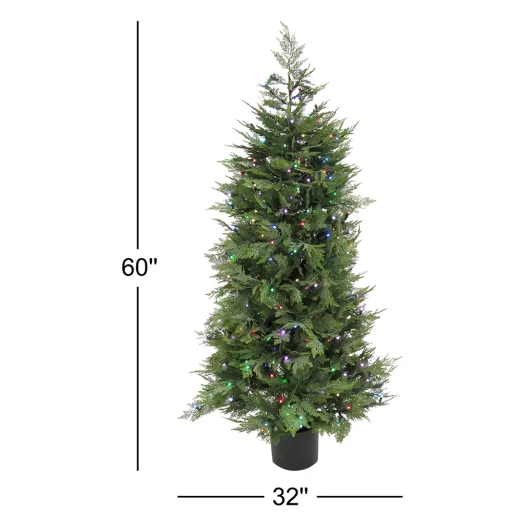 Add a touch of greenery to areas in or around your home with this artificial Cypress tree seated in a sturdy matte black nursery pot. It is strung with 300 light LED bulbs that are operated with a handheld remote control. This lighting system offers multiple functions, including steady, fading, and flashing, as well as light colors that include white, yellow, blue, red, and multi. This tree appears to be living yet requires none of the maintenance, water, or sunlight of a living plant. Display along walkways, on porch, patio, or entranceways. For indoor or outdoor use.