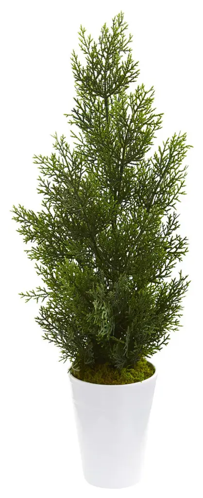 Bring a verdant touch to your look without any of the fuss of a real plant with this lovely faux topiary plant, the perfect pick for any space. Featuring dark green polyethylene foliage, this faux cedar tree brings a lifelike touch to your space. No need to water or prune—this faux plant is perfect for spaces inside and out. It arrives compressed, and requires primping of the branches, to bring it back to imitating life.