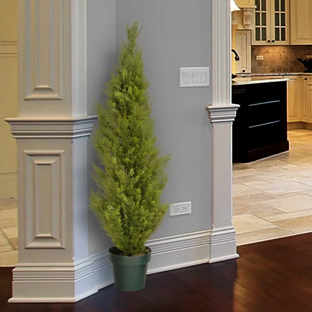 Bring a verdant touch to your look without any of the fuss of a real plant with this lovely faux topiary plant, the perfect pick for any space. Featuring dark green polyethylene foliage, this faux cedar tree brings a lifelike touch to your space. No need to water or prune—this faux plant is perfect for spaces inside and out. It arrives compressed, and requires primping of the branches, to bring it back to imitating life.