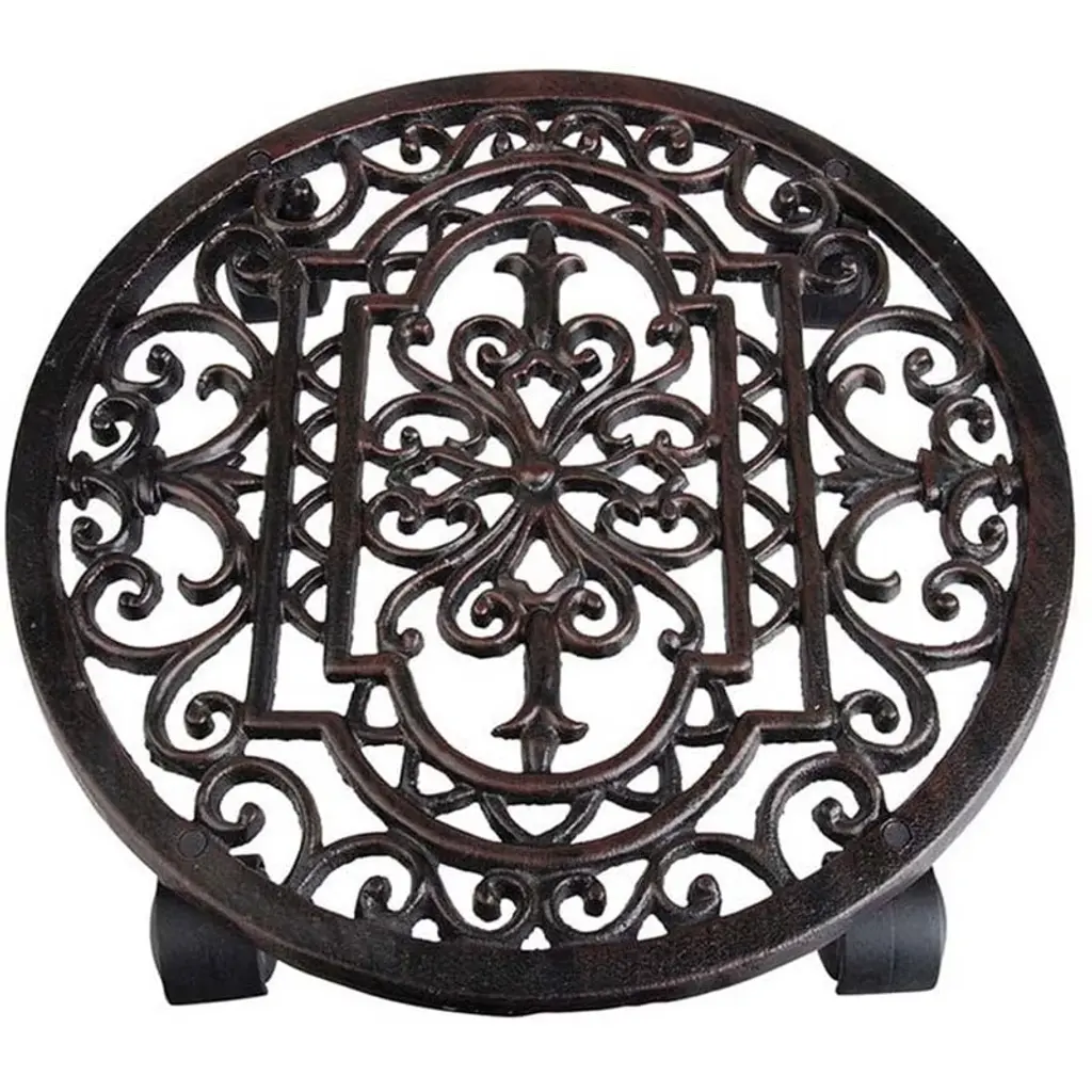Filigree Round Antique Rust Plant Trolley makes it easy to move plants around your home or deck, no matter how big and heavy the pot! Just set the potted plant on the trolley and move it to take advantage of the sunlight or change your decor. Decorative pattern adds to the beauty of the plant. Made of: Cast iron and plastic Measurements: 11-1/2" dia. x 2-1/2"H