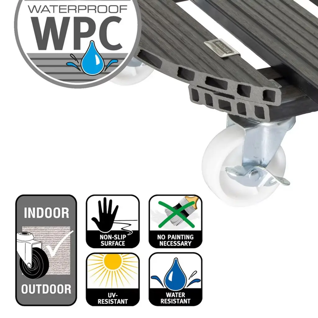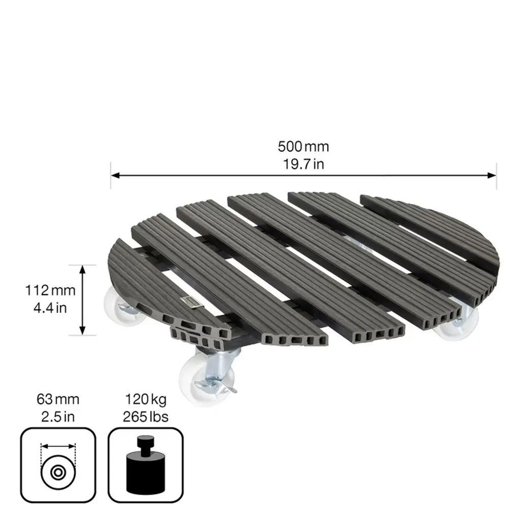 The Wagner Waterproof Extra Large Round Plant Caddy is not only stunning but also incredibly sturdy. Constructed from Wood Plastic Composite with an elegant grey finish, it's both water and UV-resistant, making it suitable for indoor or outdoor use. It comes equipped with heavy-duty, smooth-rolling caster wheels and a 25-year guarantee. Wagner, based in the southern part of Germany close to the Black Forest, is renowned for its outstanding quality. With more than 40 years of expertise in design and production, their products undergo extensive safety and durability testing. This plant caddy can support up to 265lbs and measures 20"D x 4.4"H, weighing 6.5 lbs.