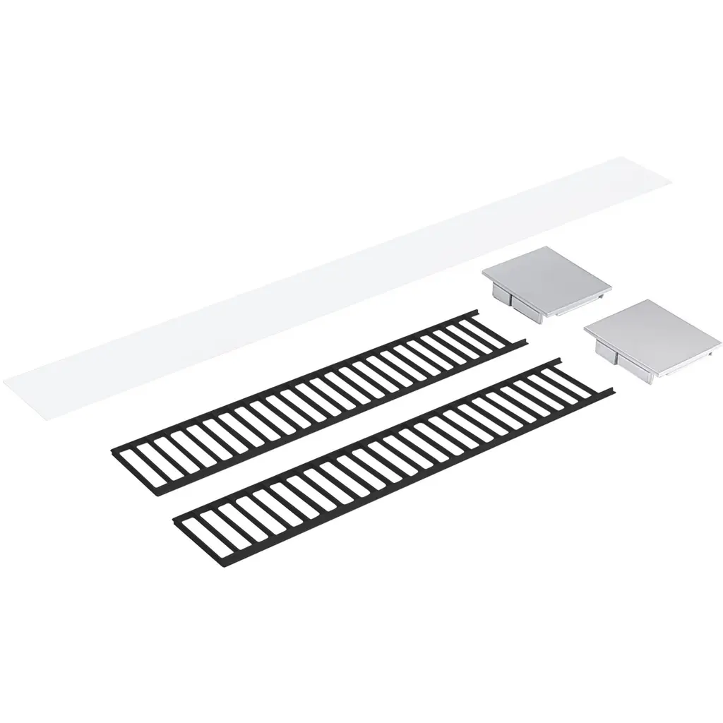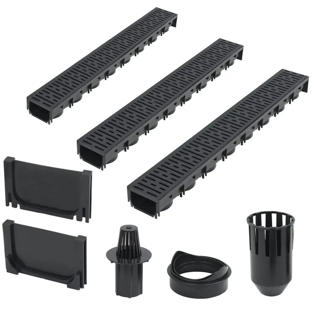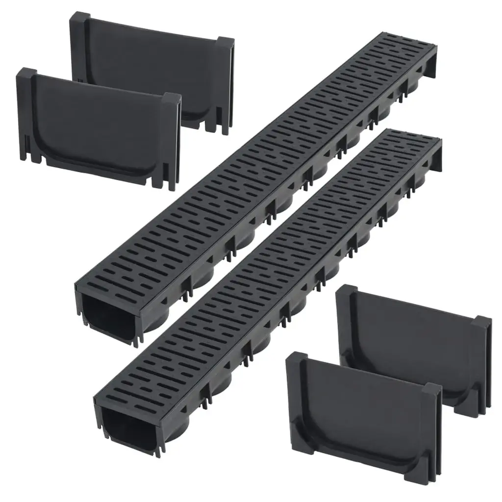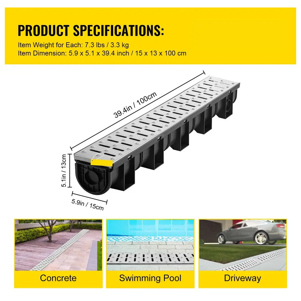Low-profile Drain System: Dimensions of each channel: 5.9" W x 5.1" H x 39.4" L/ 5.9" W x 7.5" H x 39.4" L/5.7" W x 3.1" H x 39.4" L/ 5.1" W x 3.1" H x 39.4" L. Commercial water drainage systems allow safe and efficient drainage for grassed areas, gardens, farms, patio areas, pool sides, office buildings, driveways, or factory interiors. The anti-flotation design prevents floating and doesn't require staking when setting in concrete. Easy & Quick Installation: You can connect these trench drains together for extra length. The interlocking design connects the drains tightly with no potential leak of water. Detachable grate can be manually installed and detached easily, needs no screws or bolts. It also provides a convenient way to clean the drain if it is bunged up. Various Outlet Connections: Each trench drain provides a bottom outlet with multiple sizes(3.1 inch/ 2.2 inch)/(3.1 inch/ 3.5 inch)/(48mm/ 78mm / 96mm), and a side outlet(2.2 inch/ 5.5 cm)/(3.1 inch/ 3.5 inch). You can choose the size you need. No outlet connector is required because it is already built-in; thus, the pipe can be connected directly. Durability & High Performance: Sturdy HDPE plastic and stainless steel material creates a hard and durable structure. The load capacity is A15/B125. The HDPE plastic provides a smooth interior surface, which allows faster water intake. Complete Packing List: This trench drain kit comes with three drains with built-in bottom outlets, three plastic grates, and three end caps. Plus, the outlet connector is already built-in. All the accessories that you may need are included. Friendly Note: Use hot glue to connect between manhole covers and drainage trenches, or between drainage trenches. Package Content (3 x Trench Drain 3 x Metal Grate 3 x End Cap)for 5.9" W x 5.1" H x 39.4" L/5.7" W x 3.1" H x 39.4" L option (4 x Trench Drain 4 x Plastic Grate 4 x End Cap)for 5.9" W x 7.5" H x 39.4" L/ 5.1" W x 3.1" H x 39.4" L option (5 x Trench Drain 5 x Plastic Grate 5 x End Cap)for side outlet(3.1 inch/ 3.5 inch)/multiple sizes(48mm/ 78mm / 96mm)option