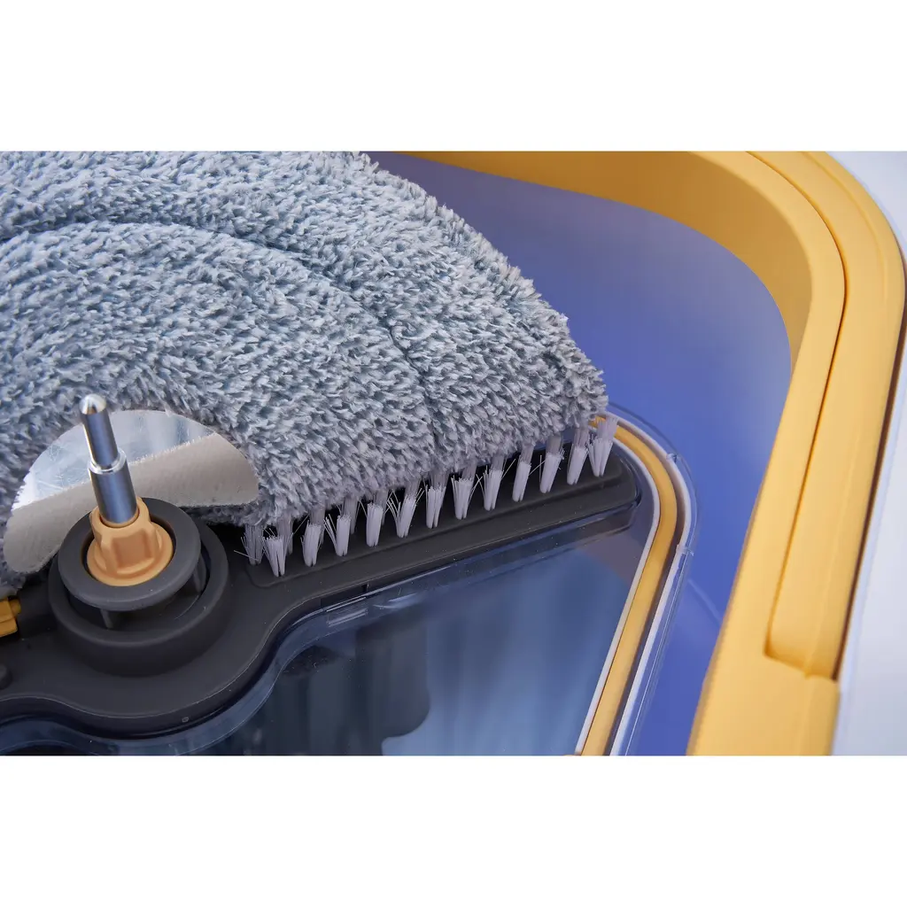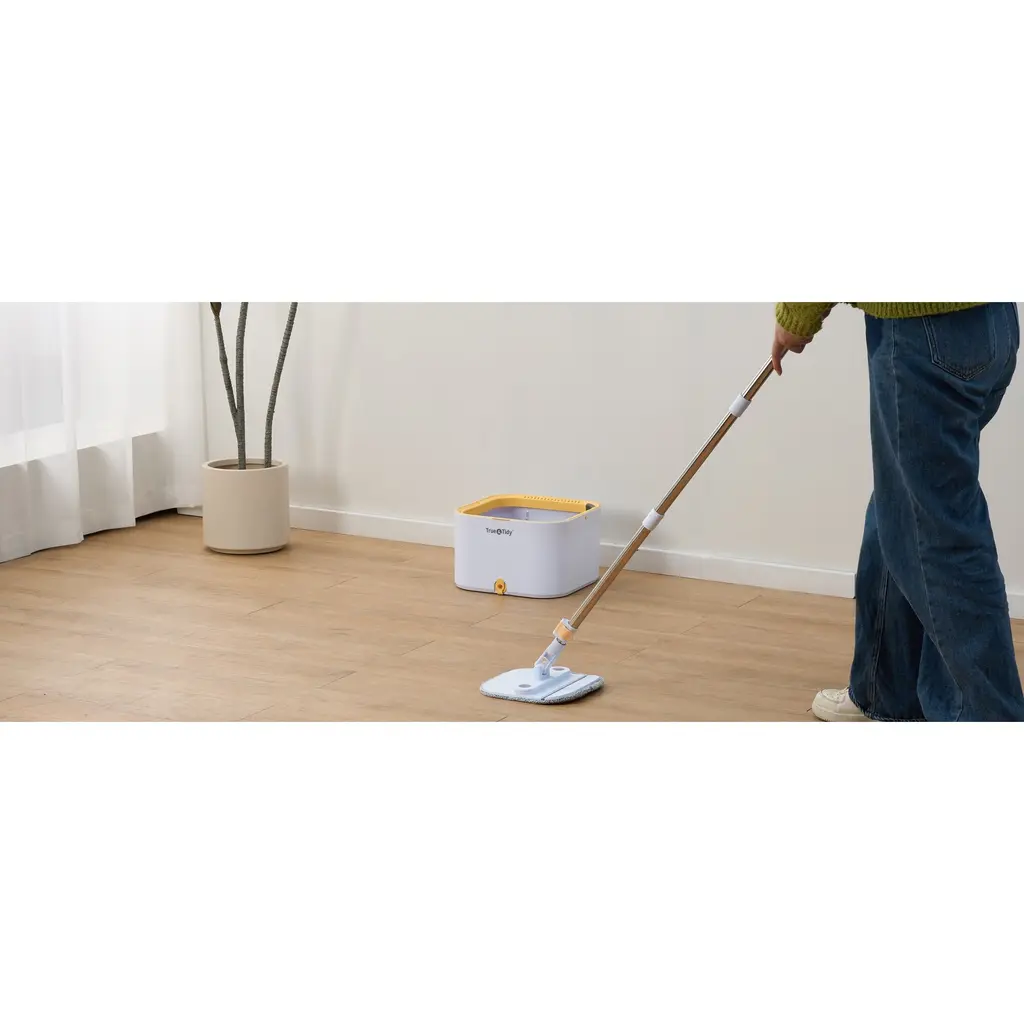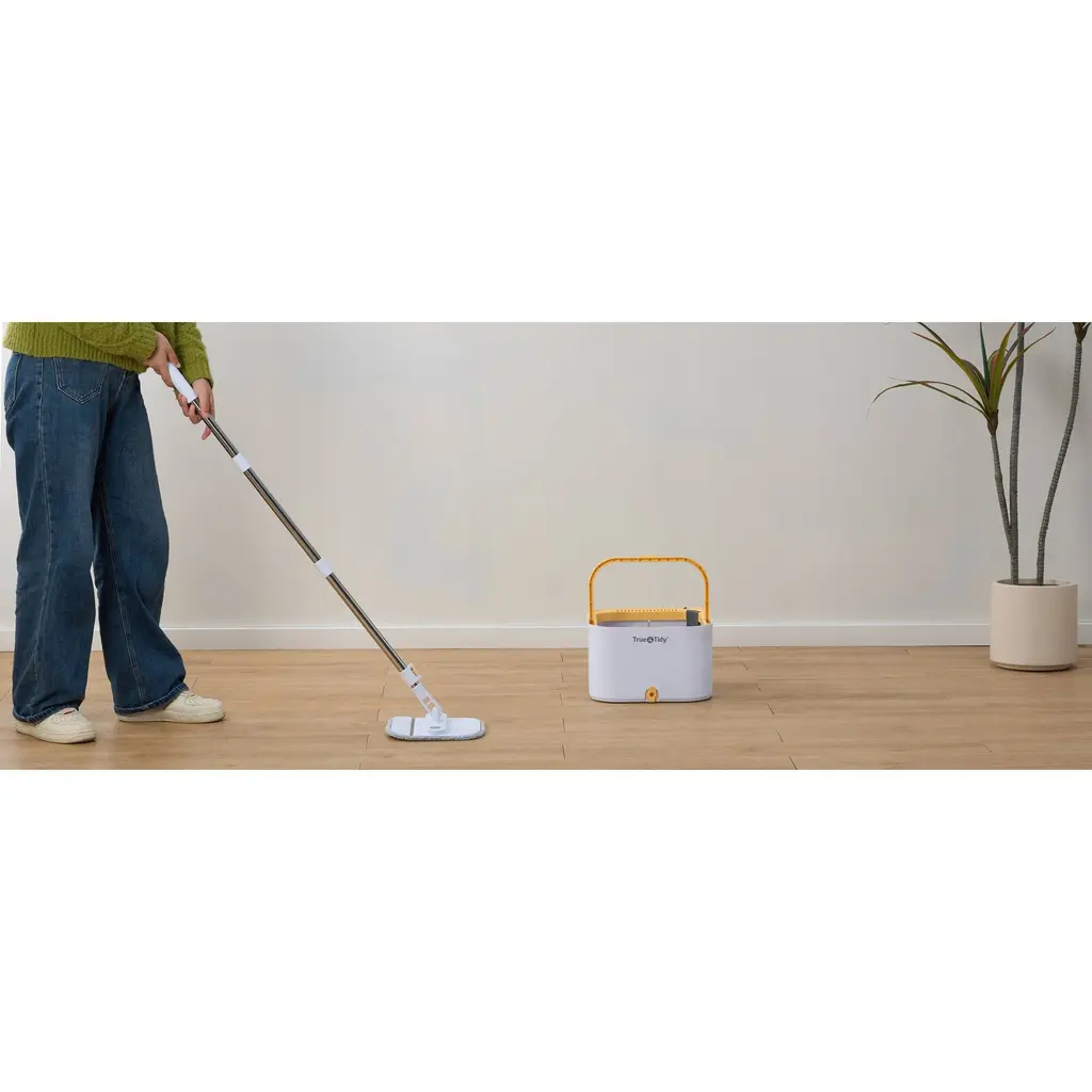 True & Tidy’s TrueClean Duo Bucket & Spin Mop System offers efficient, hygienic cleaning with separate compartments for clean and dirty water. Its machine-washable mop pads, adjustable handle, and removable inner bucket make cleaning simple and ergonomic. The folding mop head cleans baseboards, while a new side brush on the built-in scrubber handles stubborn dirt—perfect for any home.Features: