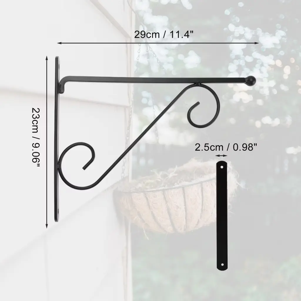 Features: 1. Crafted from quality iron material for long-lasting use. And the paint surface making it not easy to rust and corrode. This plant hanger is built to last, ensuring your plants are safe and secure. 2. Featuring a minimalist and elegant design, the plant hanger complements any decor style, from bohemian to modern, making it a stylish addition to your indoor or outdoor space. 3. With a simple yet sturdy design, this plant hanger comes hanging hooks and screws that allows you to effortlessly hang it anywhere in your home or garden. 4. Suitable for a variety of pot sizes and shapes, this plant hanger is suitable for showcasing your favorite plants, flowers, herbs, or lanterns, adding a touch of greenery to any space. 5. Surprise your friends or family with this practical and chic plant hanger, an ideal gift for plant lovers or anyone looking to beautify their living space effortlessly. Specification: Color: Black; Material: Iron; Length: 29cm / 11.4"; Width: 23cm / 9.06"; Height: 2.5cm / 0.98"; Package List: 2 Pcs Plant Hanger, 4 Pcs Screws, 4 Pcs Expansion Bolts.