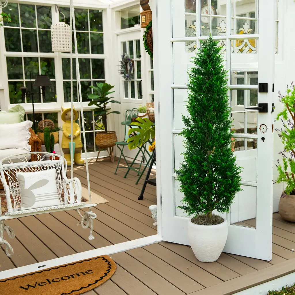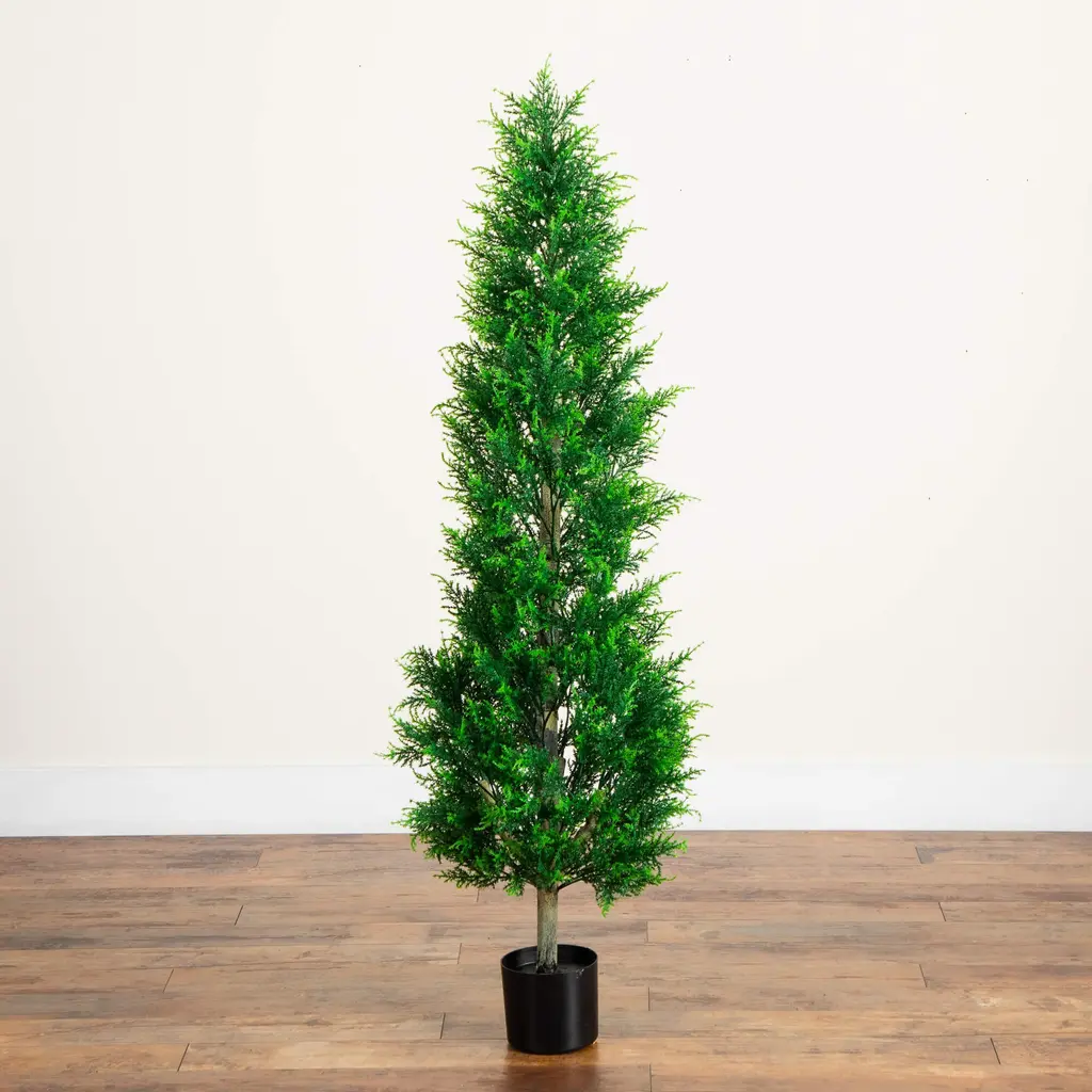 Stop dreaming about your perfect outdoor space. This artificial cypress tower tree, removes the guesswork and maintenance in crafting your ideal look. Inspired by the majestic, manicured gardens in Europe, each leaf looks incredibly lifelike. Crafted from high-quality materials, bend the branches for a custom, unique look sure to impress the guests without them knowing it's faux. Manufactered through a special process, these pieces are UV-resistant, to ensure their longevity -- be sure to place under a covered area outdoors. Standing 5-Ft from a nusery pot, DIY and add to a planter of your choice. Make your wishes come true today and display these artificial trees in clusters for an elevated look.