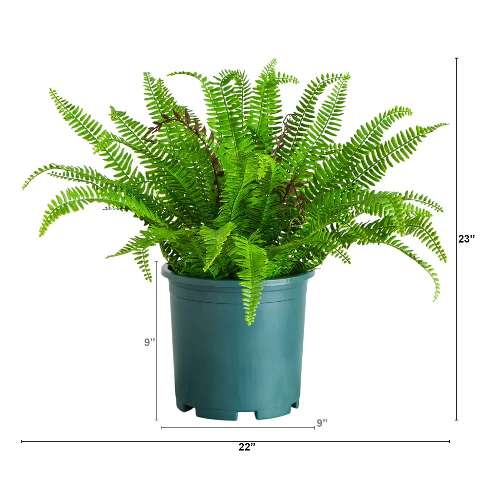 No need to venture deep into the jungle to bring lushness to your home indoors or out! With ruffled, textured, and long leaves, this UV resistant artificial Boston fern plant provides the verdant touch you've been looking for. Crafted from high-quality materials via a special process, they can withstand the outdoor elements. Feel free to shape the branches as you see fit, to accommodate any space placed. With a lush canopy that spans 27-In display it in a decorative pot for a more realistic feel. This lifelike piece would make an ideal focal point on a patio or front porch entrance.