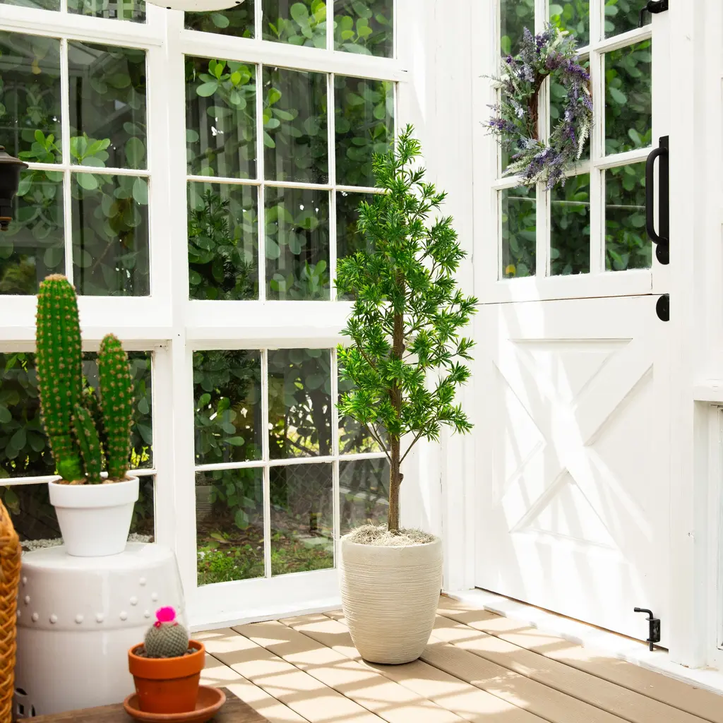 Enhance your outdoor or indoor space with this UV-resistant artificial podocarpus tree. Crafted from high-quality materials, this tall and slender tree boasts lifelike green foliage that adds a touch of elegance to any setting. Perfect for your patio, front porch, or even inside your home, this tree's UV-safe design ensures it will remain vibrant and beautiful, season after season. Standing at 6-Ft tall, whether you place it in a decorative planter by your front door or on your patio to complement your outdoor furniture, it'ss an effortless way to elevate your decor. Its sleek, modern shape makes it a versatile addition to both contemporary and traditional styles, while its low-maintenance nature means you can enjoy the beauty of nature without any hassle.