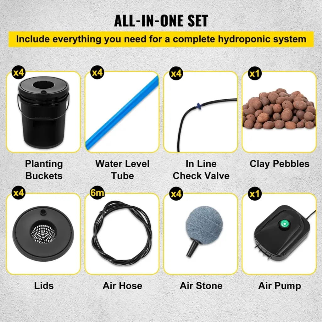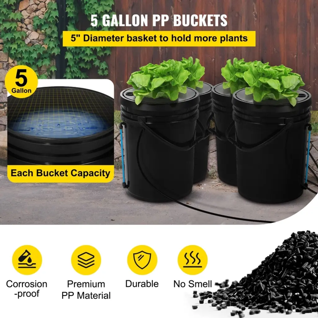 Vevor Dwc Hydroponic System, 5 Gallon 4 Buckets, Deep Water Culture Growing Bucket, Hydroponics Grow Kit With Pump, Black