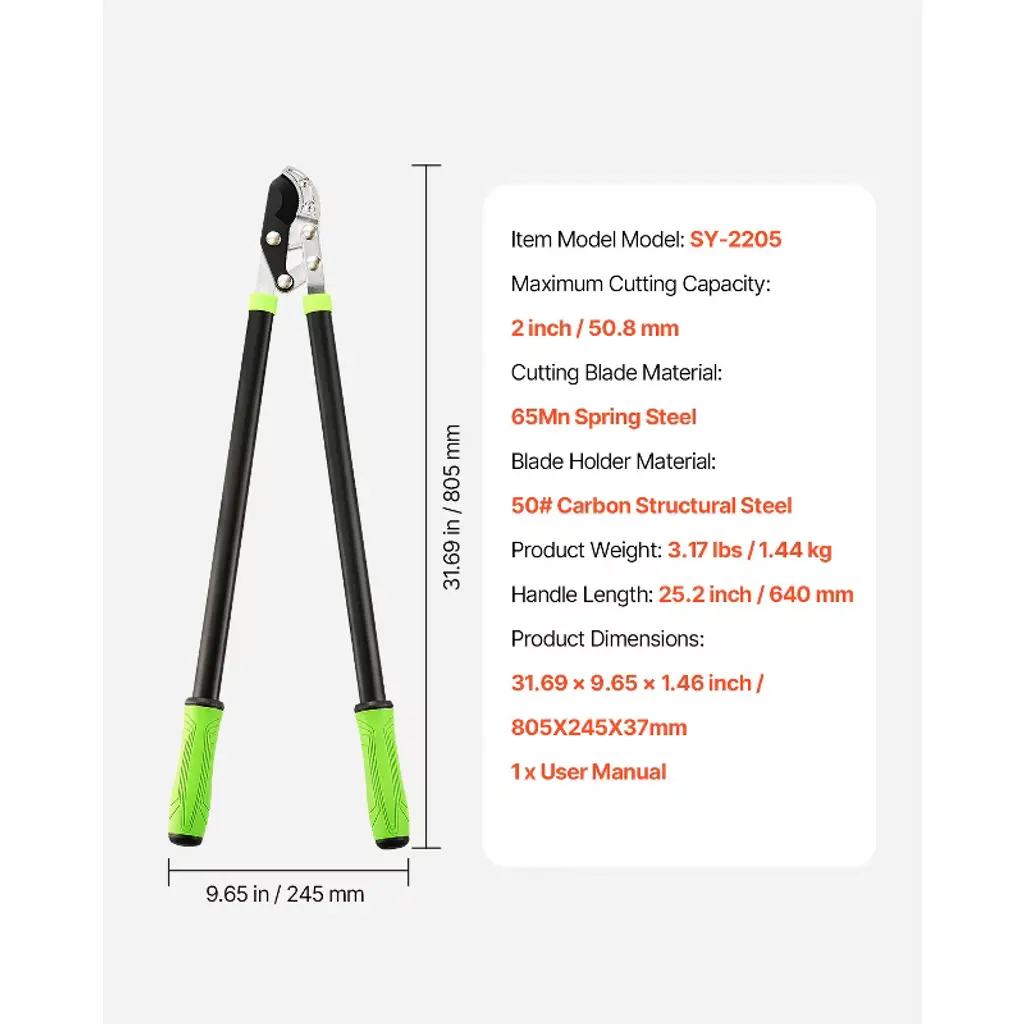 Feature: Ideal Lopper for Tree Trimming: This 32-inch steel blade lopper for tree trimming features a maximum cutting capacity of 2-inch diameter, making it ideal for trimming branches to maintain your yard and garden, promoting the appearance of your plants Sharp Steel Blade: The anvil lopper blade is made of high-quality alloy steel, ensuring sharp cuts, sturdiness and durability. The surface is coated with a low-friction, non-stick coating that makes cutting smoother and enhances rust resistance. It helps reduce hand fatigue and maintains sharpness even after many times of use. The C-shaped hugging blade holder effectively grips the branches, making it easier to cut 4-point Labor-saving Lever Design: This hand lopper features a 4-point lever drive principle that provides up to 4 times the power, making trimming tasks effortless. After a full day of pruning, you won’t feel fatigued Comfortable Grip: The non-slip soft rubber handles of our garden lopper provide a comfortable grip and excellent control. It reduces hand fatigue during prolonged use and improves trimming efficiency Wide Application: This heavy duty lopper is ideal for trimming green living branches and dry wood, fruit trees, shrubs, hedges, and landscaping. These garden pruning tools can handle all your indoor and outdoor pruning tasks with ease Package Content: 1 x Lopper for Tree Trimming 1 x User Manual