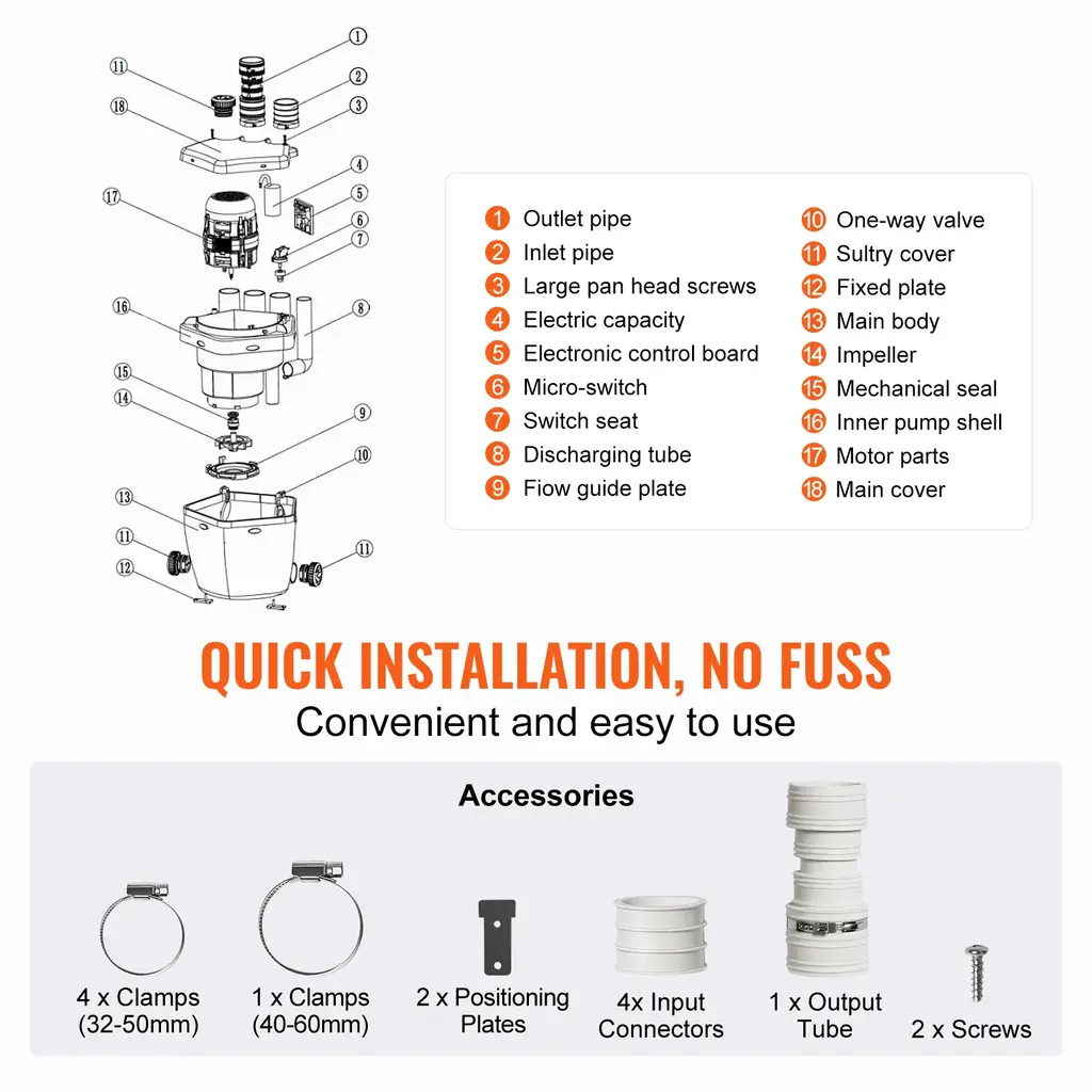 Durable and Reliable: Our utility sink pump is built to last, meeting ETL standards with an oil-filled copper-wire motor to prevent overheating. Crafted from corrosion-resistant cast aluminum, it ensures stable, long-lasting performance, keeping your basement dry without fail. Rapid Drainage: This powerful drain pump, boasting 1/2 HP input power and 1/3 HP output power, spins at a whopping 3500 RPM, delivering a maximum flow rate of 1500 GPH. With a max head of 18 ft and a wide 1-1/2" outlet, it ensures swift water removal for all your needs. Low Drainage Outlet: Say goodbye to standing water in your shower or bathtub! Our sink pump comes with a low discharge outlet at the bottom, making it super easy for sewage to flow out smoothly. No more clogs or slow drainage - just efficient waste disposal! Oil-Filled Motor: Enjoy peace and quiet with our sump pump's oil-filled copper-wire motor. Its advanced design reduces vibration, minimizing noise for a more serene environment. Now you can drain water quickly and quietly, without disturbing your peace or your neighbors! Easy Installation: Installing our under-sink sump pump is a breeze! Just attach the pump, vertical switch, and discharge pipe to your drainage bucket, and you're good to go. No need for complicated setups or lengthy instructions - get it done in no time and start enjoying a dry, hassle-free basement today! Package Content 1 x Utility Sink Pump 4 x Clamps 2 x Positioning Plates 1 x Output Tube3 x Input Connectors 2 x Screws