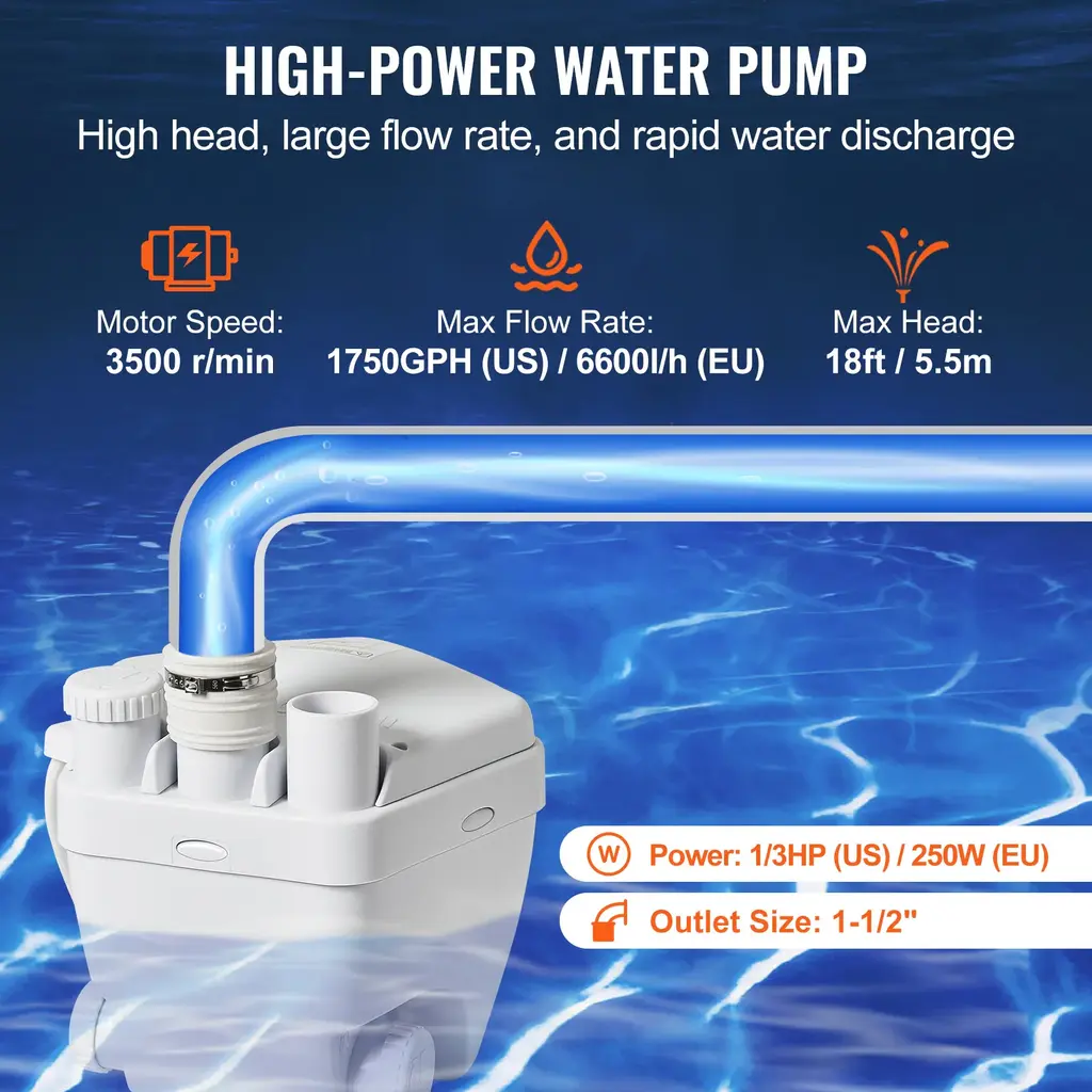 Vevor Utility Sink Pump, 1/3 Hp, 120-Volt, 1750 Gph Flow, 18 Ft Head, Under-Sink Sump Pump System With Copper Wire Motor - 18 Ft - 18 Ft