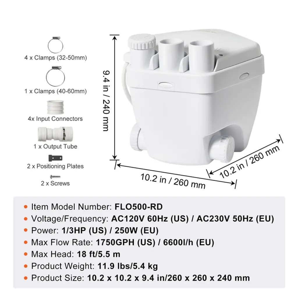 Feature: Durable and Reliable: Our utility sink pump is built to last, meeting ETL standards with an oil-filled copper-wire motor to prevent overheating. Crafted from corrosion-resistant cast aluminum, it ensures stable, long-lasting performance, keeping your basement dry without fail. Rapid Drainage: This powerful drain pump, boasting 1/2 HP input power and 1/3 HP output power, spins at a whopping 3500 RPM, delivering a maximum flow rate of 1500 GPH. With a max head of 18 ft and a wide 1-1/2" outlet, it ensures swift water removal for all your needs. Low Drainage Outlet: Say goodbye to standing water in your shower or bathtub! Our sink pump comes with a low discharge outlet at the bottom, making it super easy for sewage to flow out smoothly. No more clogs or slow drainage – just efficient waste disposal! Oil-Filled Motor: Enjoy peace and quiet with our sump pump's oil-filled copper-wire motor. Its advanced design reduces vibration, minimizing noise for a more serene environment. Now you can drain water quickly and quietly, without disturbing your peace or your neighbors! Easy Installation: Installing our under-sink sump pump is a breeze! Just attach the pump, vertical switch, and discharge pipe to your drainage bucket, and you're good to go. No need for complicated setups or lengthy instructions – get it done in no time and start enjoying a dry, hassle-free basement today! Package Content 1 x Utility Sink Pump 4 x Clamps 2 x Positioning Plates 1 x Output Tube 3 x Input Connectors 2 x Screws