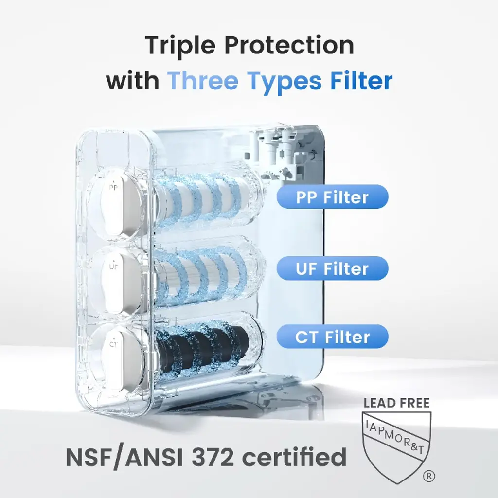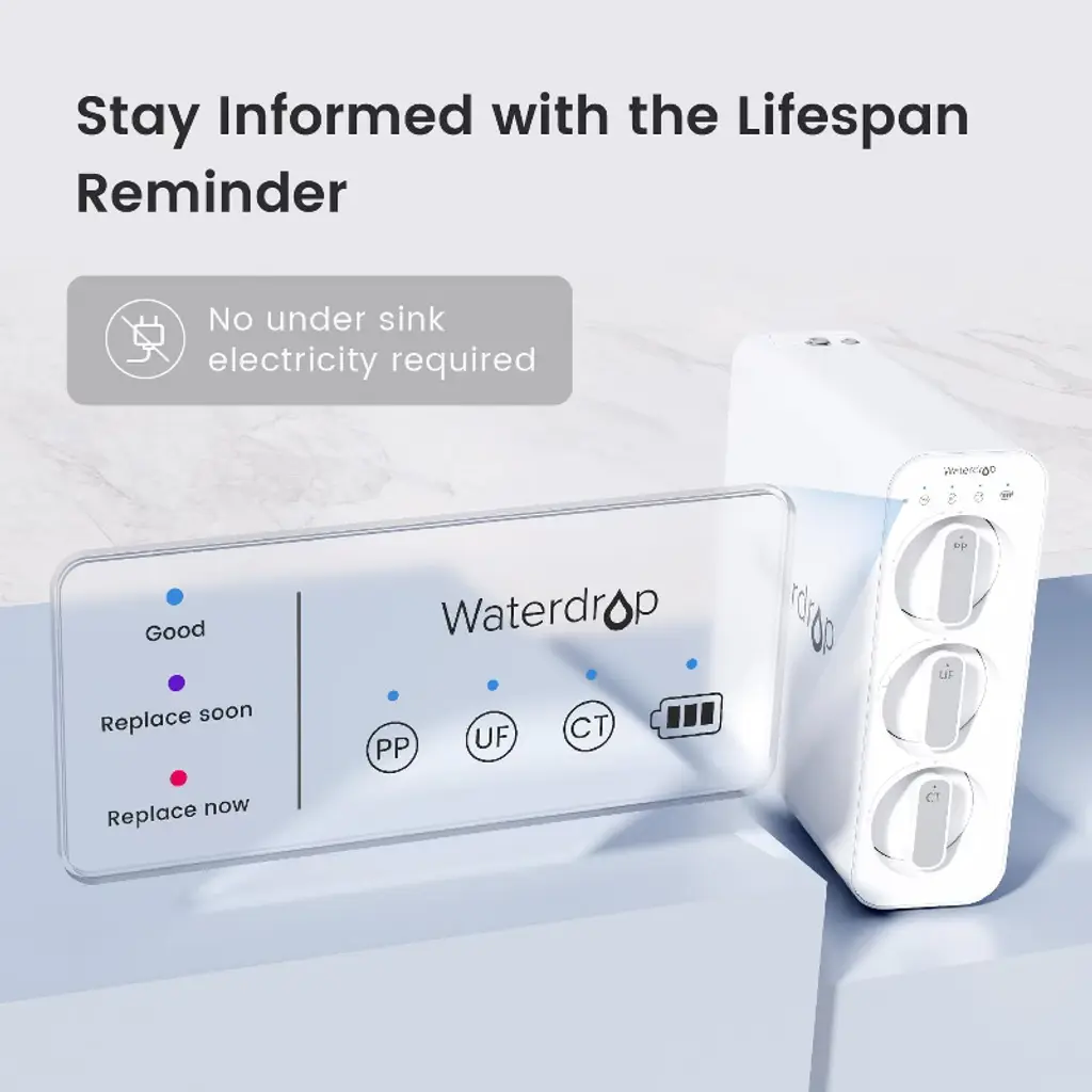 About this item Save Water & Keep Minerals: This under sink water filter system reduces 30+ substances, and retains essential minerals in the water. No wasted water, no need for power source, and no pressure drop. Note: This under sink water filtration system will NOT REDUCE TDS.Taste the Difference in Our Water: 0.01 micron Waterdrop Ultrafiltration Membrane, this under sink water filtration system filters chlorine, PFAS, taste, odor and heavy metals, offering enhanced taste.Buying bottled water 5 gallons at a time is costly and problematic, no more big bottles of water on your counter.Smart Lifespan Reminder: Sleek black panel with four lights indicates will tell you when to change the filters.24 Month Filter Lifespan: UF filter with a 24-month lifespan reduces replacement frequency, minimizing long-term maintenance costs.CT filter 12 months,PP filter 6 months.Slim & Space-Saving: Dimensions of 4.68"W x 13.97"H x 14.81"L fit small spaces, suitable for cabinets even with a large food disposal taking up a lot of space.Easy Installation: everything needed to install filter is included in the box,this under sink water filter accommodates both 1/2" and 3/8" under sink water pipes.Premium Nickel Faucet: High-quality brushed nickel faucet adds elegance and durability to your kitchen.