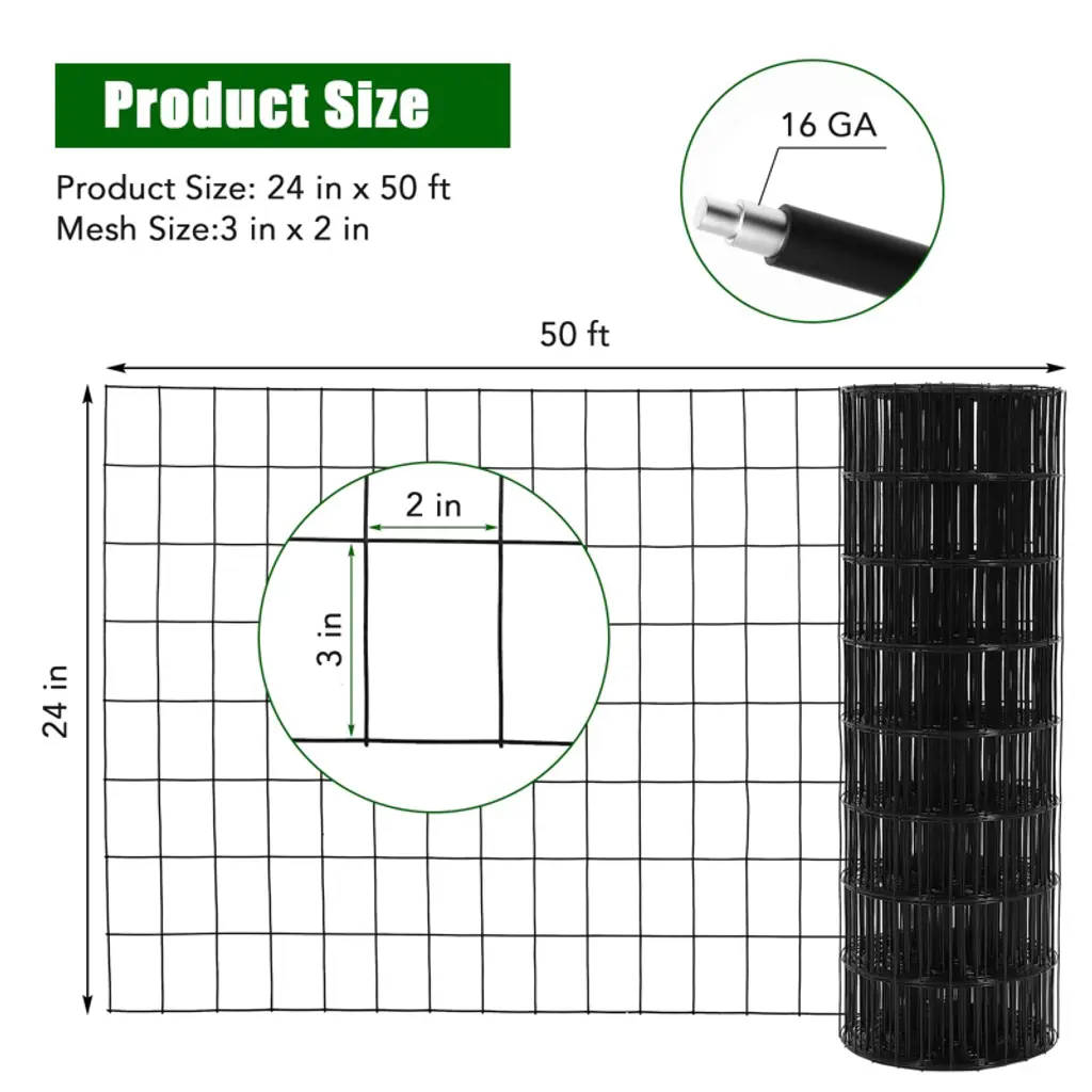 Wire Mesh Fence Roll 24inx50ft, 2Inchx3inch 16ga Galvanized Steel Poultry Netting For Garden Yard Animals Plants Protection, Farm Fencing, Black