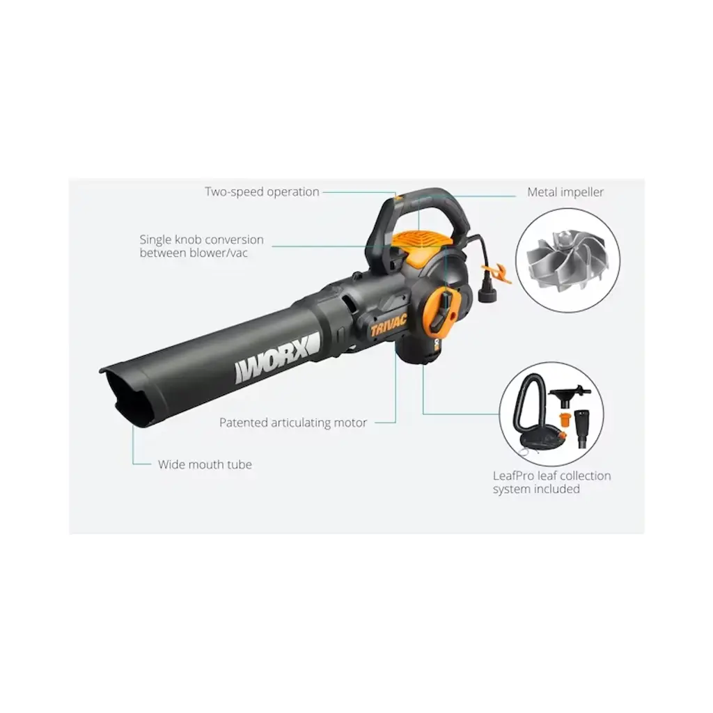 Worx Wg524 12 Amp Trivac 3-in-1 Electric Leaf Blower/mulcher/vac With Leaf Collection System