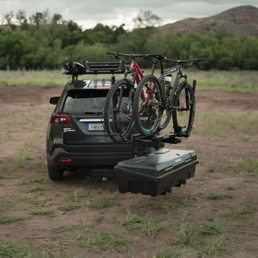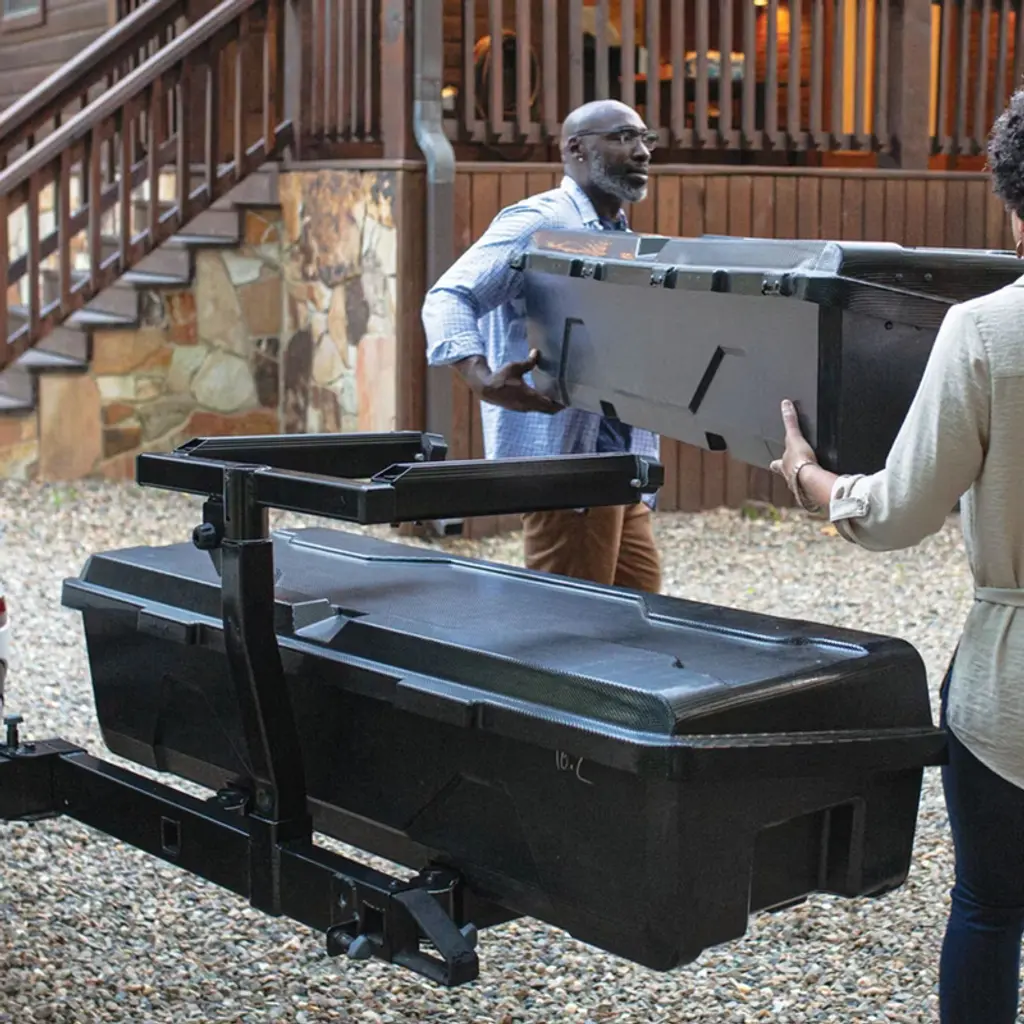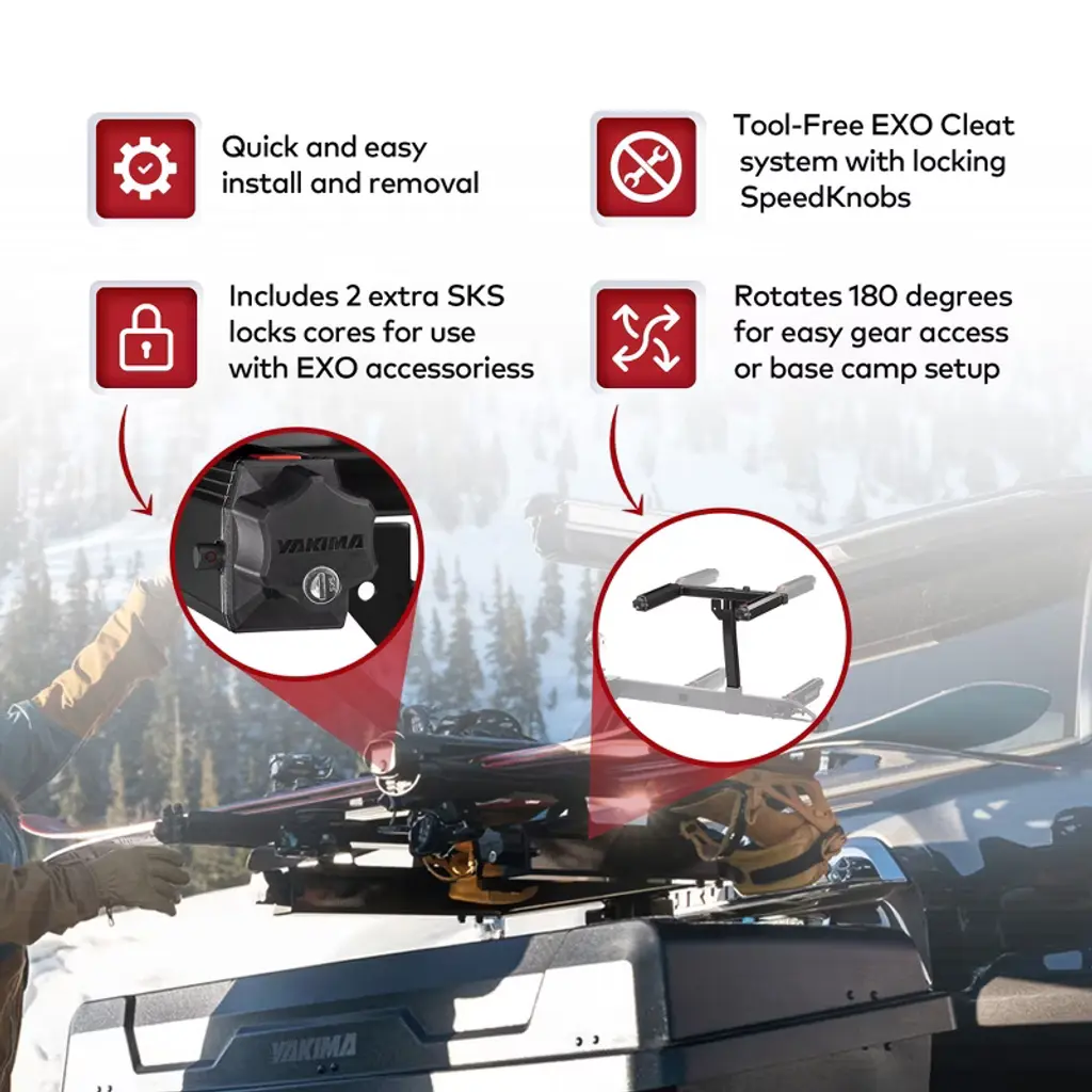 Embark on thrilling adventures and outdoor travels while ensuring all your necessities can be along for the journey. With the EXO TopShelves from Yakima, your hitch capacity can be doubled with the second tier or super accessible storage. Whether you're cycling, camping, skiing, hiking, or needing to double your load for your next trip, the EXO TopShelves can mix and match EXO accessories to make any adventure easier. The TopShelves are compatible with and require an EXO SwingBase to create a second level on your EXO Hitch system. Constructed of aluminum materials, the storage shelves provide increased durability. Made to rotate 180 degrees relative to the EXO SwingBase, you'll easily be able to access your gear on the lower level or set up base camp mode with the included jack stands. A hitch-mounting vehicle accessory loads your cargo bins and can be secured to your car. For a quick, easy installation and removal process, use the tool-free EXO Cleat system with locking SpeedKnobs, and you'll be set to ride. Including 2 extra SKS locks for use with EXO accessories, the equipment you need for the next campsite will be secured to the back of your vehicle, ensuring peace of mind when you hit the road. The second-level system base keeps your gear at hand so you can bike, ski, and relax all in the same weekend. Unleash your adventurous side on your next journey with the Yakima EXO TopShelves.