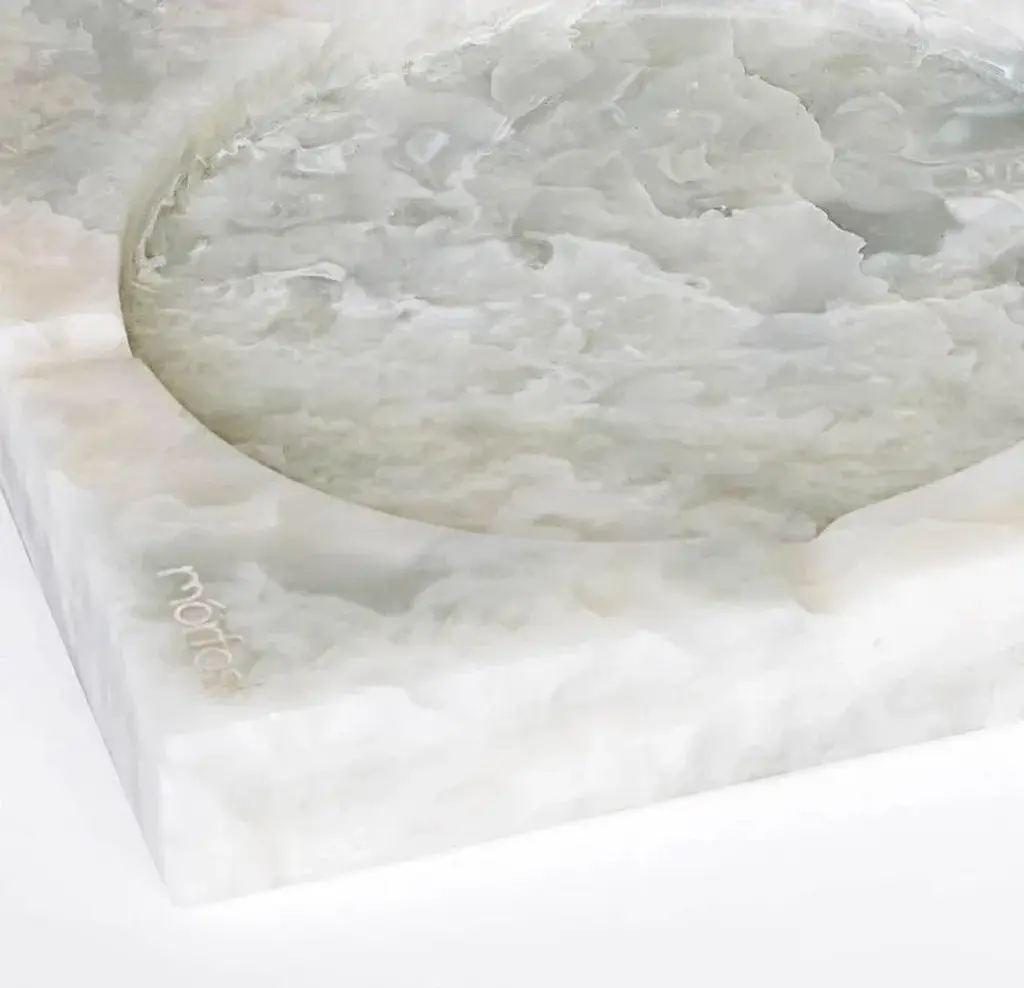 "A" marble ashtray - Morfosi Dimensions: D 20 x W 20 cm Materials: White Afyon marble. Available in custom dimensions and materials. The Morfosi brand has as its guideline the stylistic reinterpretation of marble, through the fusion with other noble materials. Transformation is the key word of this company, where the raw material, marble, becomes furniture and objects with simple lines, but with a great visual effect.