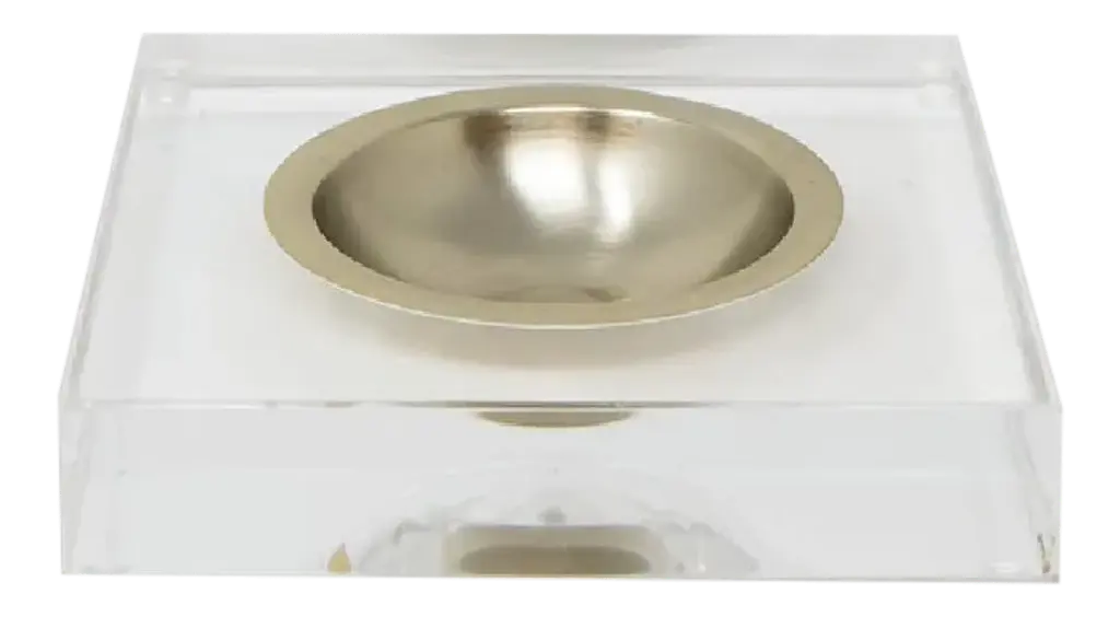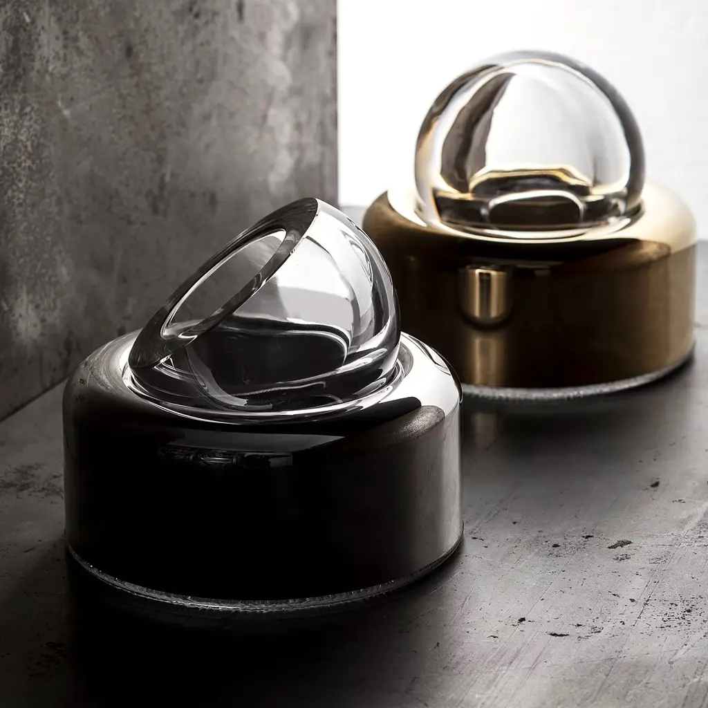 Designed in 1963 by Joe Colombo, this ashtray is part of the Biglia Collection, whose design is centered on the perfect volume of a marble sphere. The top part, made of transparent crystal, rests on a metal base with a gold plating that adds a refined and retro-chic accent for this elegant sculptural object of functional decor. For a striking display, it is possible to pair this with the Biglia Black Ashtray.
