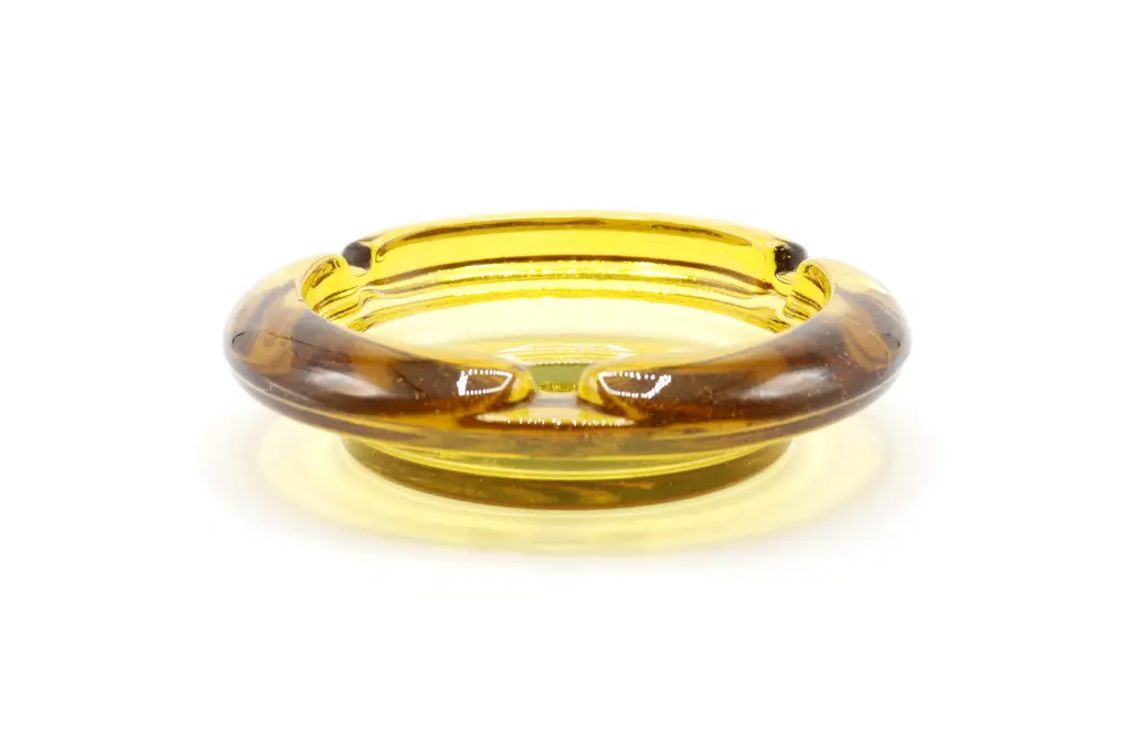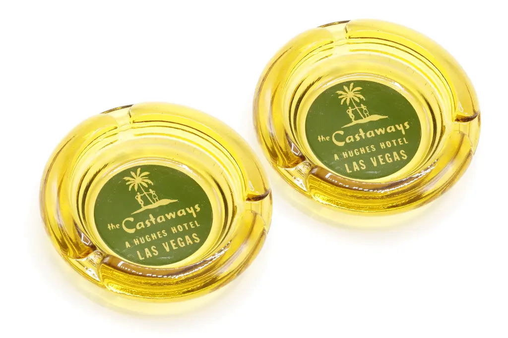 A pair of yellow glass ashtrays from The Castaways Hotel, a hotel and casino in Paradise, Las Vegas, Nevada. The center is printed with a green circle branded with the Castaways logo. The hotel, permanently closed in 1987, was opened in 1963 and purchased in 1967 by billionaire Howard Hughes. Dimensions per ashtray.