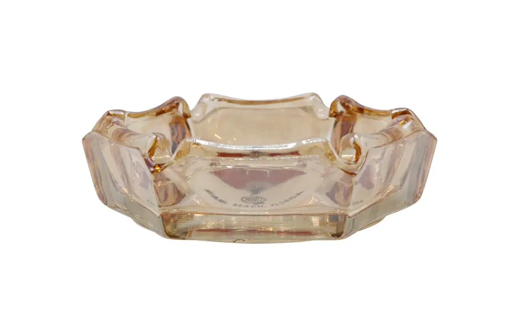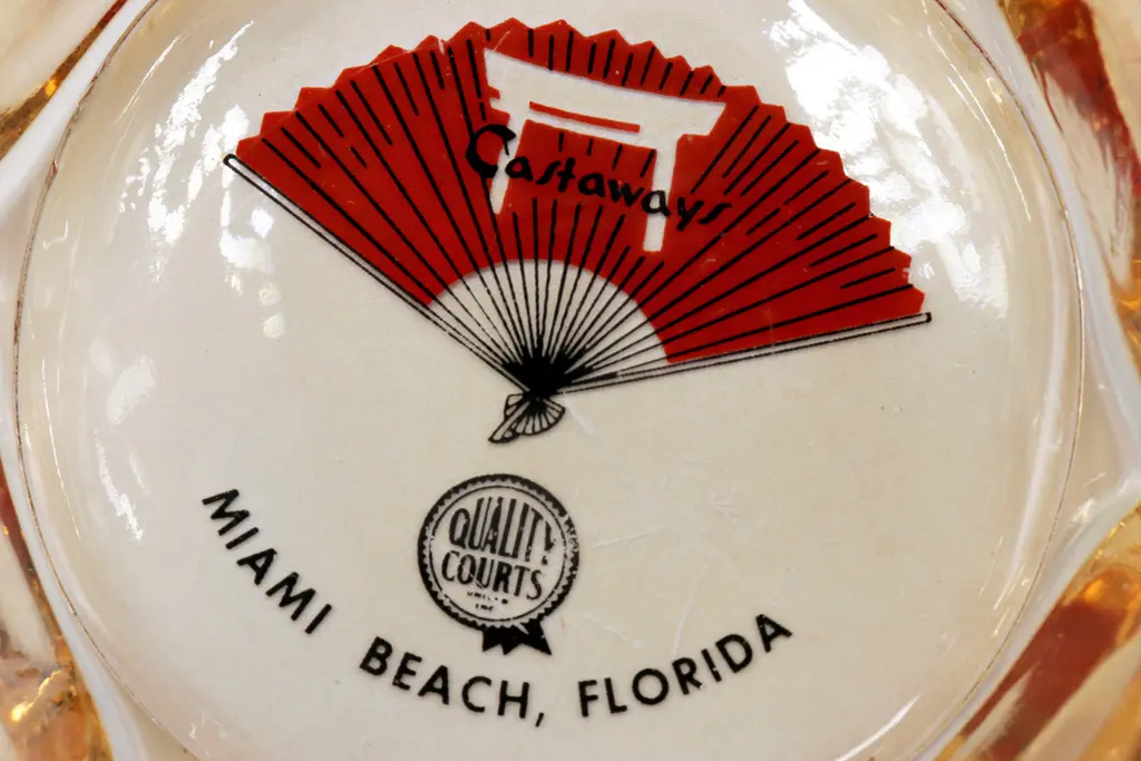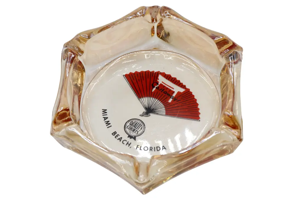 A pair of hexagonal glass ashtray from The Castaways Hotel of Miami Beach, Florida. The center is printed with their logo and reads “Castaways, Quality Courts, Miami Beach Florida”. Dimensions per ashtray.