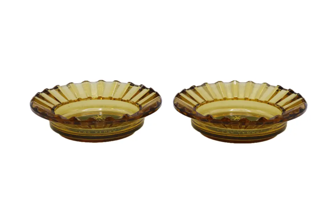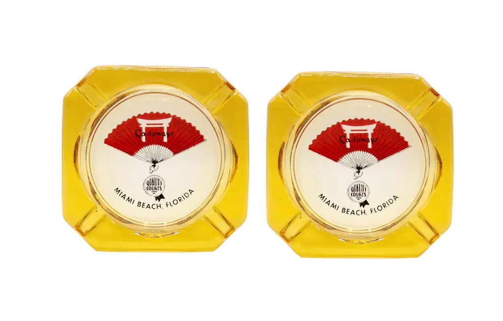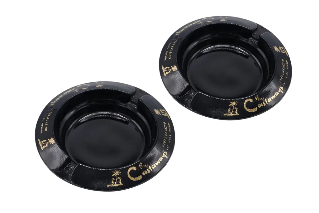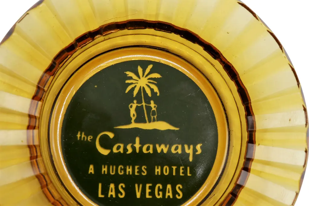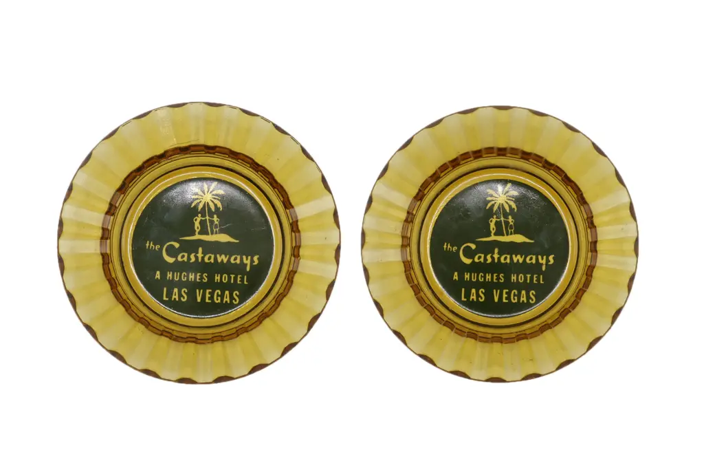 A pair of yellow tinted glass ashtrays from The Castaways Hotel, a hotel and casino in Paradise, Las Vegas, Nevada. The center is printed with a green circle branded with the Castaways logo. The hotel was opened in 1963, purchased in 1967 by billionaire Howard Hughes and permanently closed in 1987. Dimensions per ashtray.