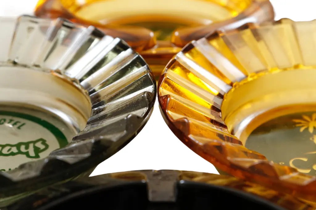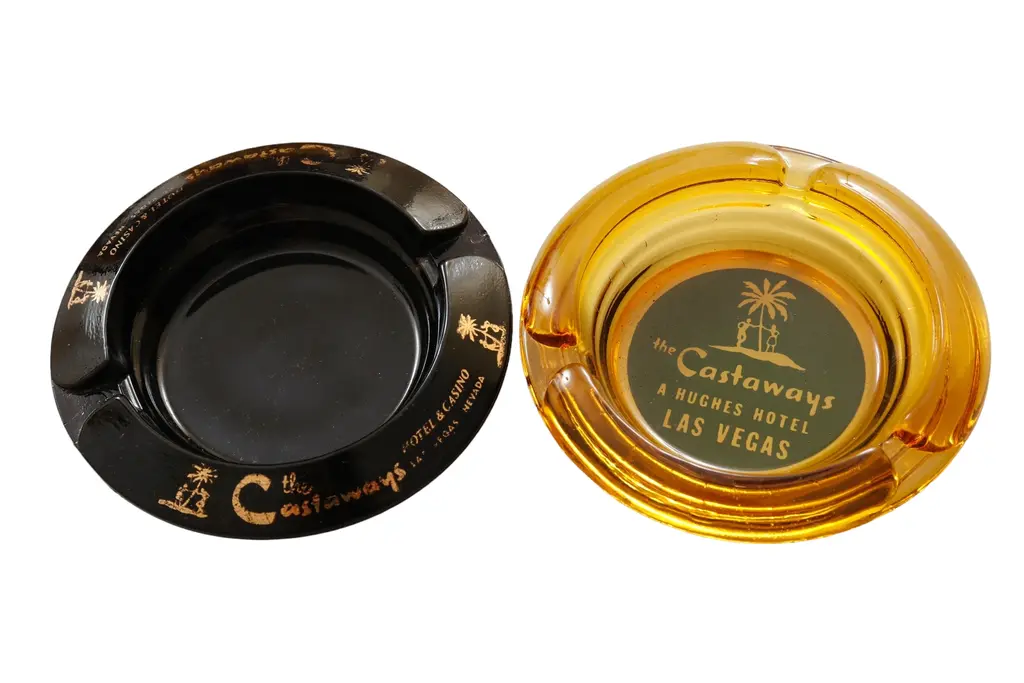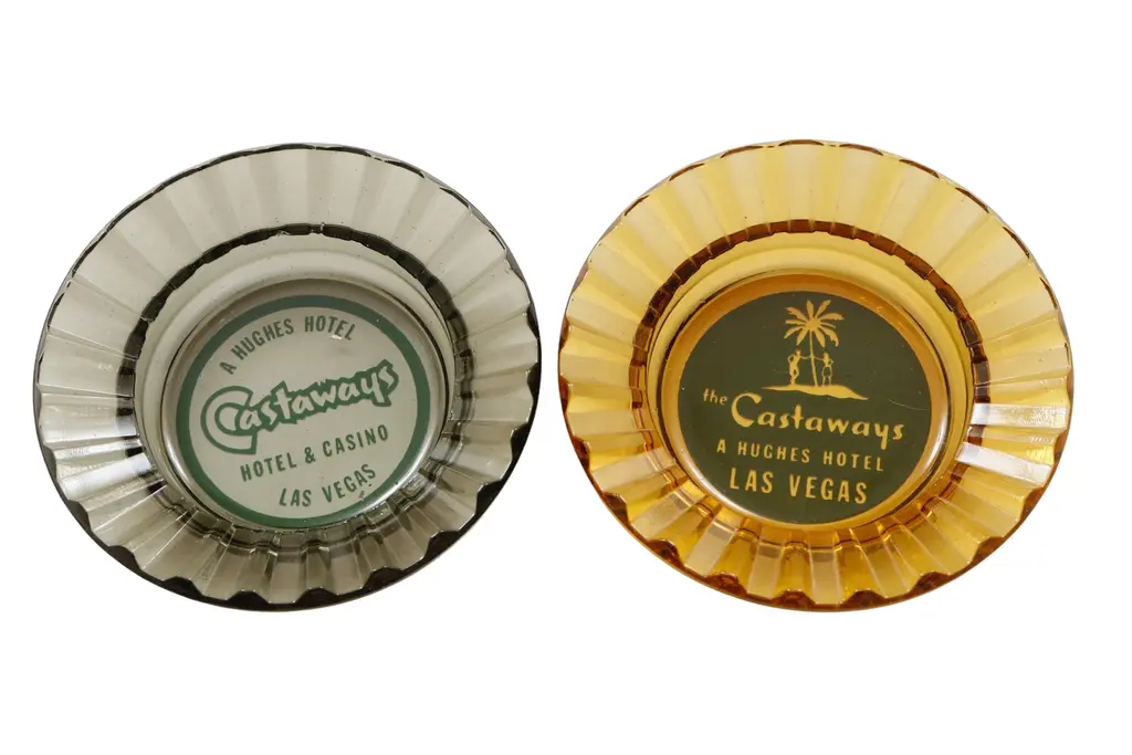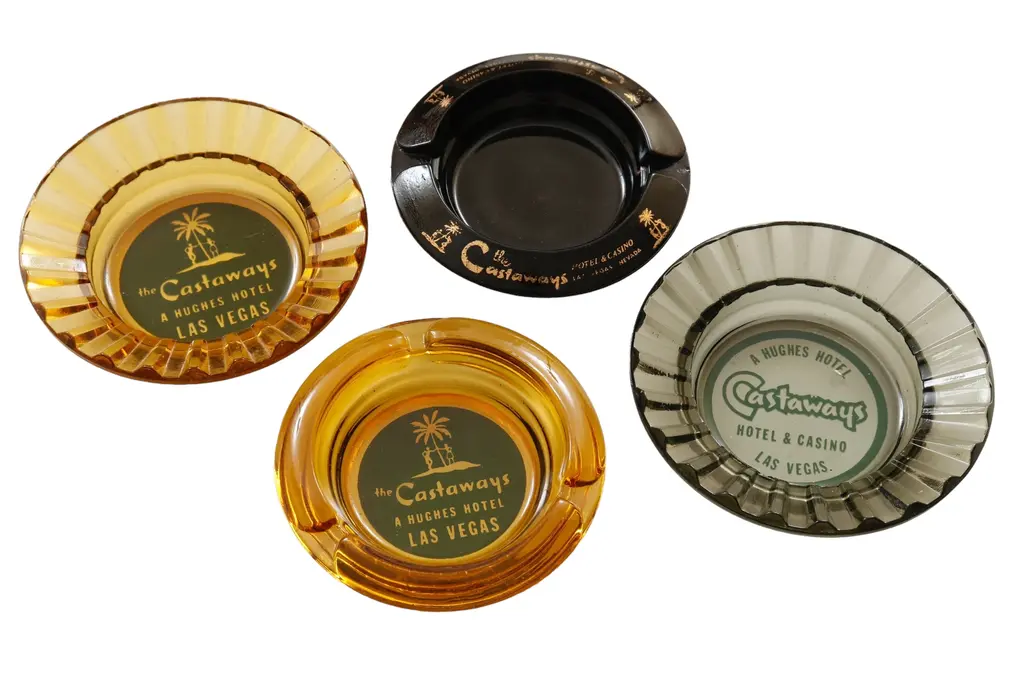 A set of four glass ashtrays from The Castaways Hotel of Las Vegas, Nevada. The hotel, permanently closed in 1987, was opened in 1963 and purchased in 1967 by billionaire Howard Hughes. Each is in excellent condition. Dimensions per ashtray.