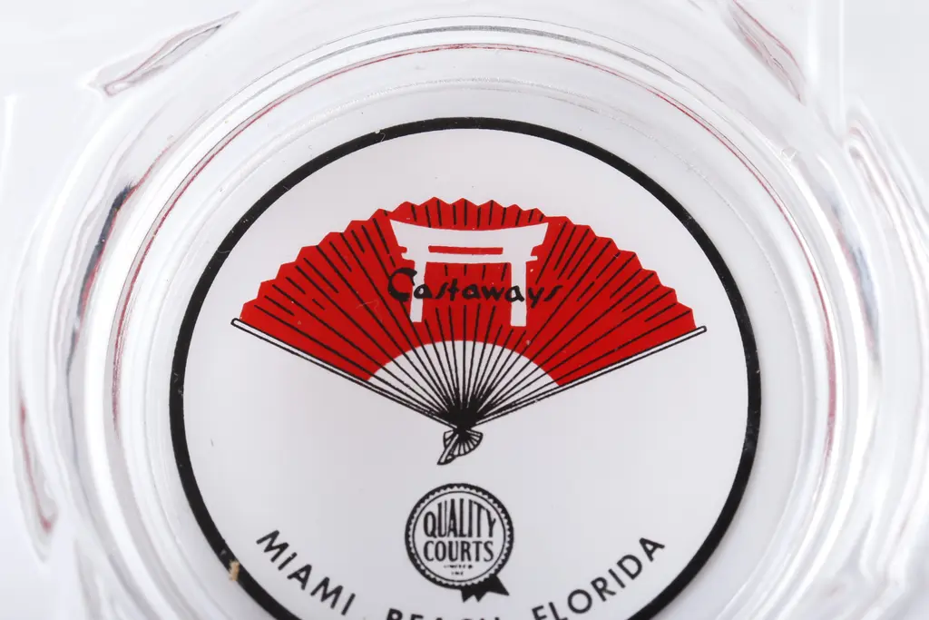 A clear glass ashtray from The Castaways Hotel of Miami Beach, Florida. The center is printed with their logo and reads “Castaways, Quality Courts, Miami Beach Florida”.