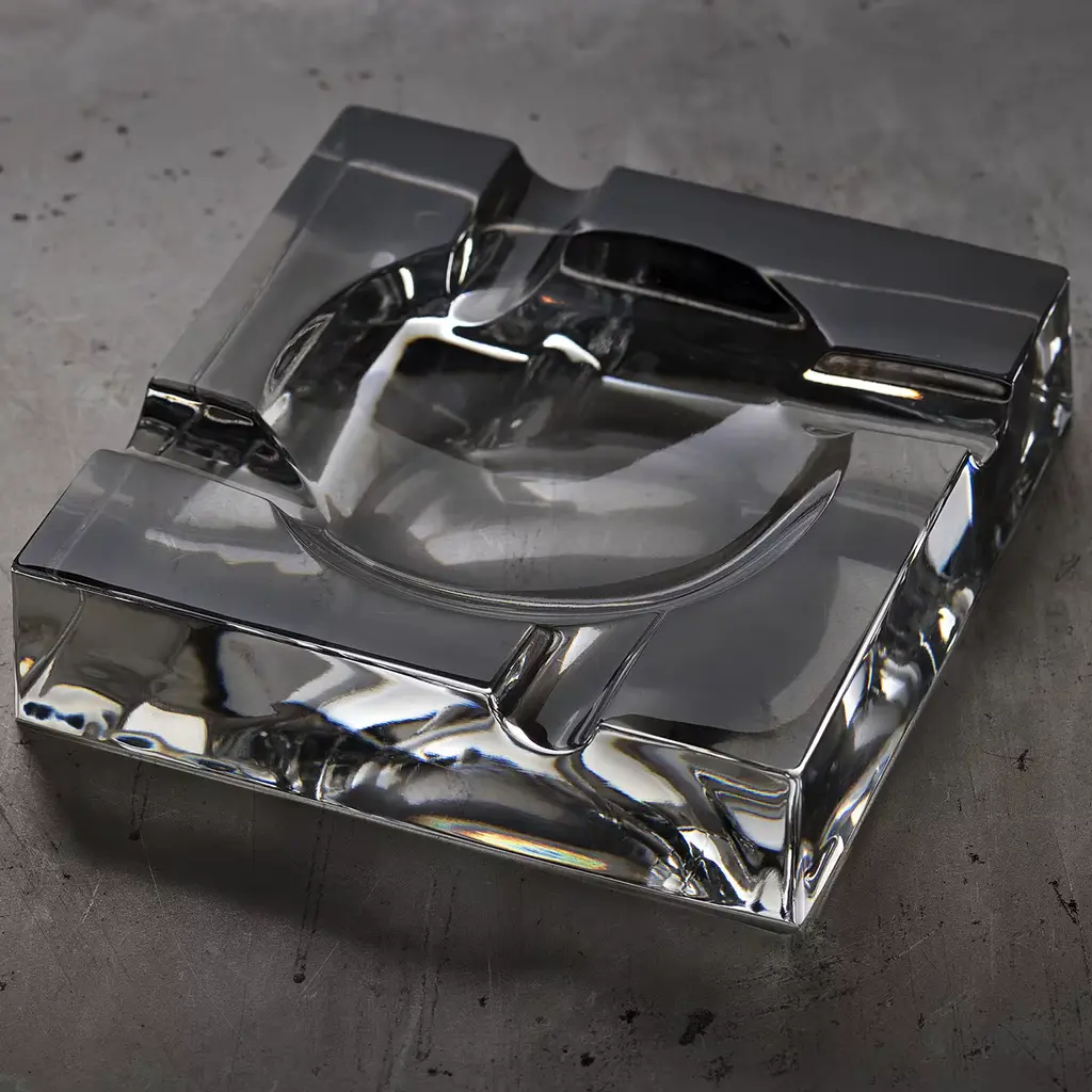 This impeccable cigar ashtray is a piece of functional decor of superb elegance. Designed by Ufficio Tecnico ADC in 2018, it is fashioned of clear crystal and boasts a sturdy silhouette enhanced by a natural interplay of lights and reflections on the glass.