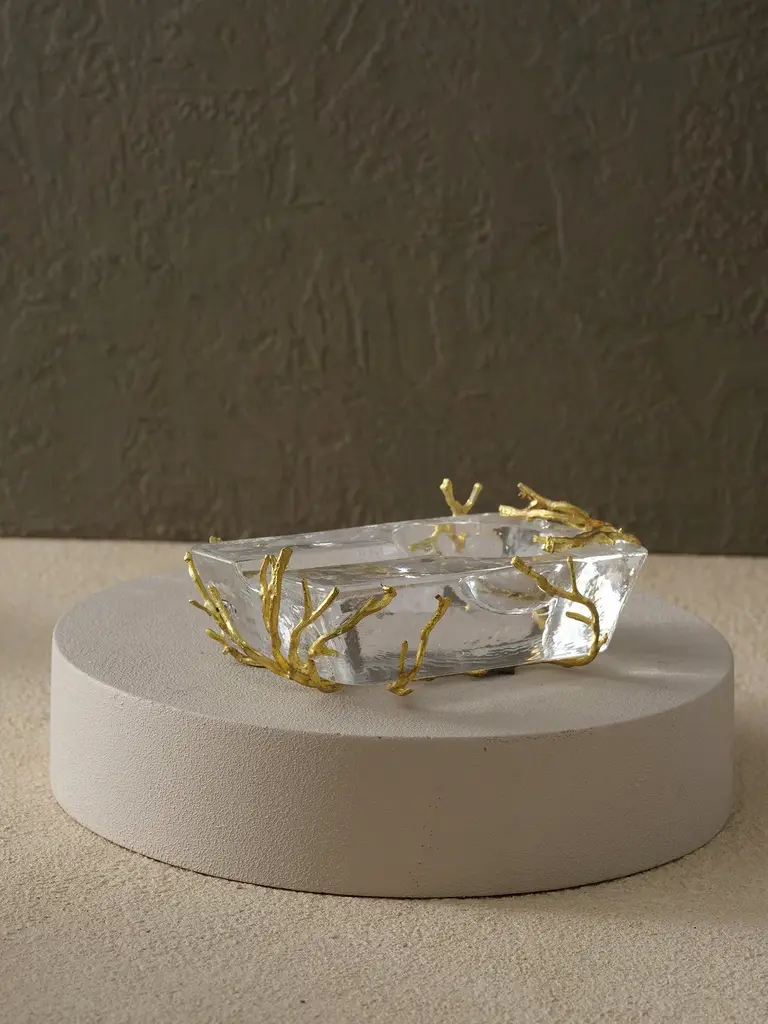 Inspired by nature’s quiet elegance, the Crystal Glass Ashtray with Gold Vine Detailing brings organic beauty into refined interiors. The clear crystal body showcases sharp, polished lines that catch the light with every angle, while gilded vine-like branches curl around the edges in an artful embrace. The sculptural gold detailing lends a luxurious, almost ethereal quality—like golden ivy frozen in time. Ideal for a coffee table, cigar bar, or bookshelf, this piece strikes a perfect balance between functionality and decorative allure.