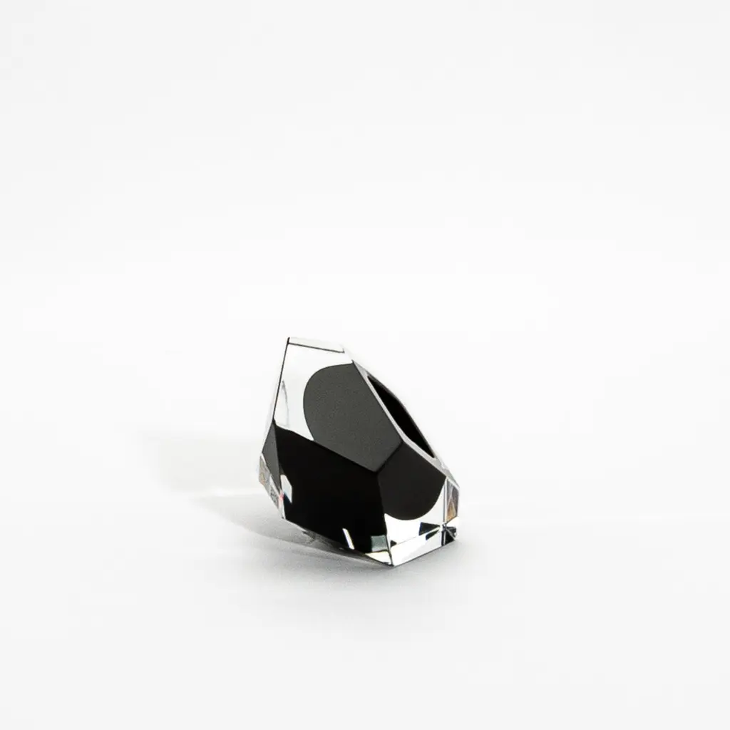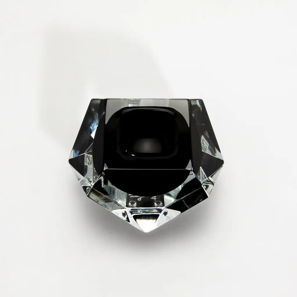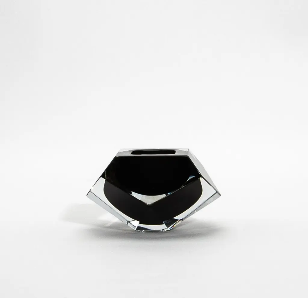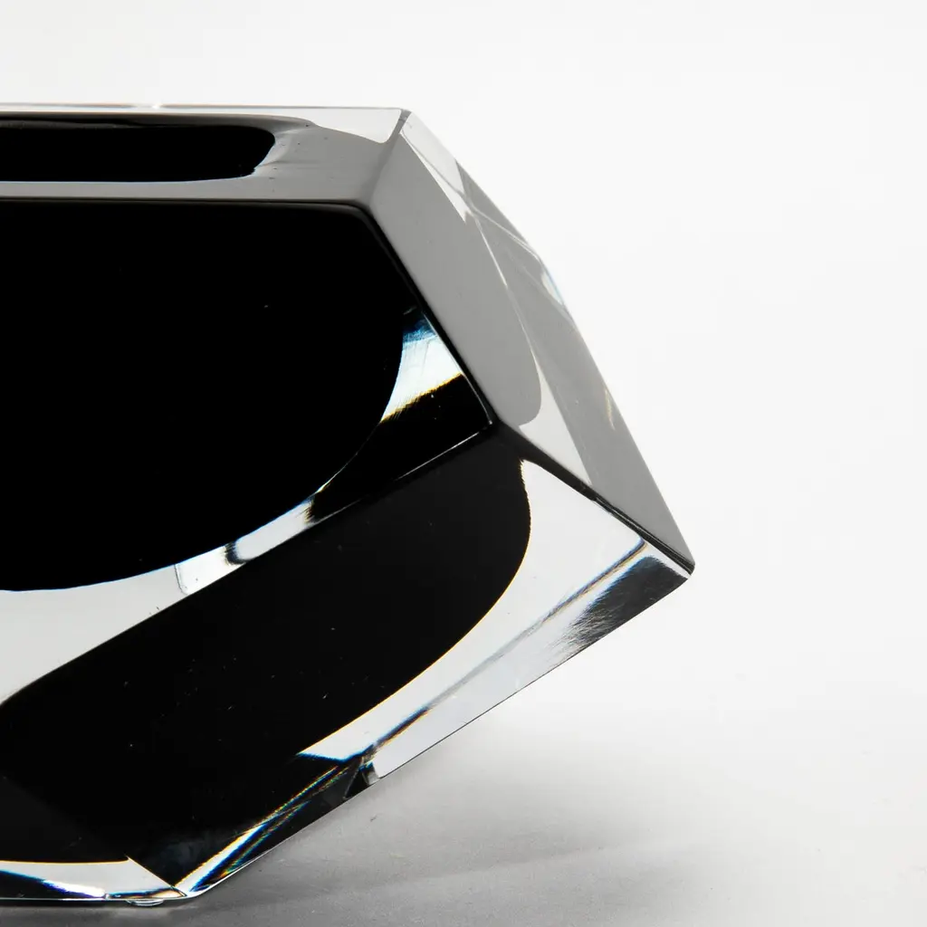 This exquisite hand-blown Murano ashtray is a true masterpiece of Venetian glass artistry, combining elegance and functionality in one luxurious design. Crafted from the finest Murano glass, its striking clear and onyx black hues create a mesmerizing contrast that captures light beautifully, transforming it into a dynamic interplay of shadows and reflections. The angular yet fluid form embodies a perfect blend of modern minimalism and timeless sophistication, making it not only a practical piece but also a stunning decorative object. Whether adorning a coffee table or serving as a conversation-starting accent, this handcrafted ashtray showcases the unmatched craftsmanship and artistry synonymous with Murano's rich tradition. A statement of refinement, it adds a touch of contemporary luxury to any setting.