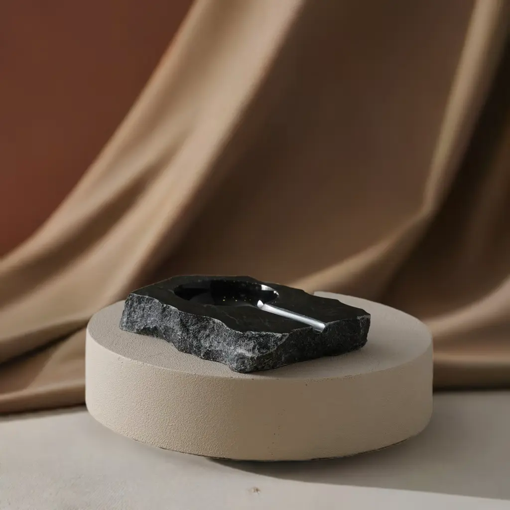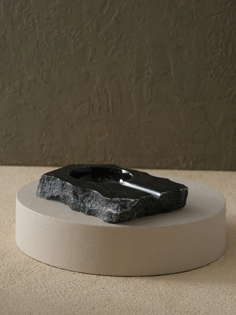 Bold, tactile, and undeniably refined—the Hand-Carved Black Marble Cigar Ashtray makes a striking addition to any interior. Sculpted from a single piece of dark marble, this artisanal piece retains its raw edges, celebrating the natural texture of the stone. The interior is polished to a sleek finish, forming a smooth recessed bowl and cigar rest. Designed for the modern sophisticate, this ashtray pairs everyday ritual with timeless artistry. Whether in a minimalist den or a moody cigar lounge, it adds a grounded sense of luxury.