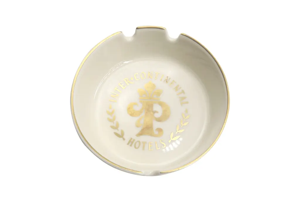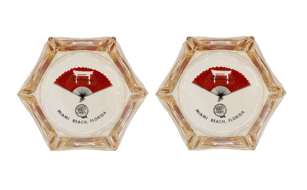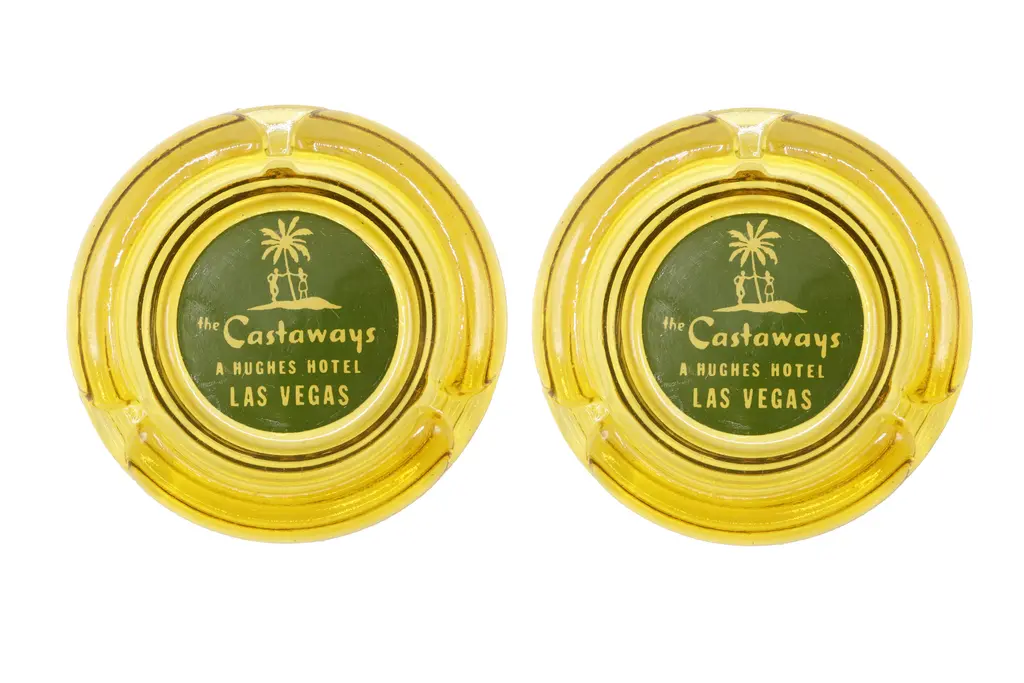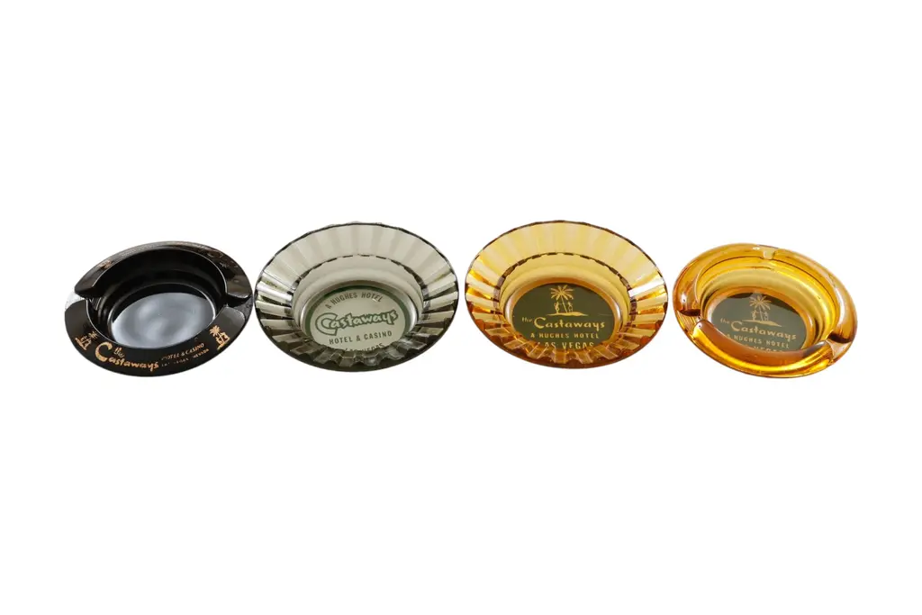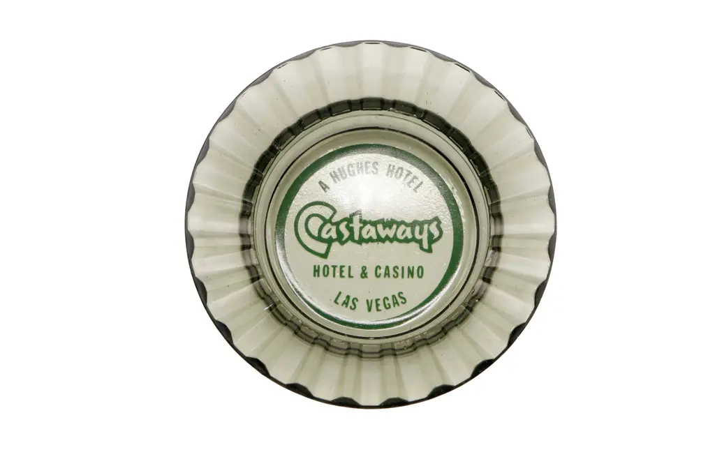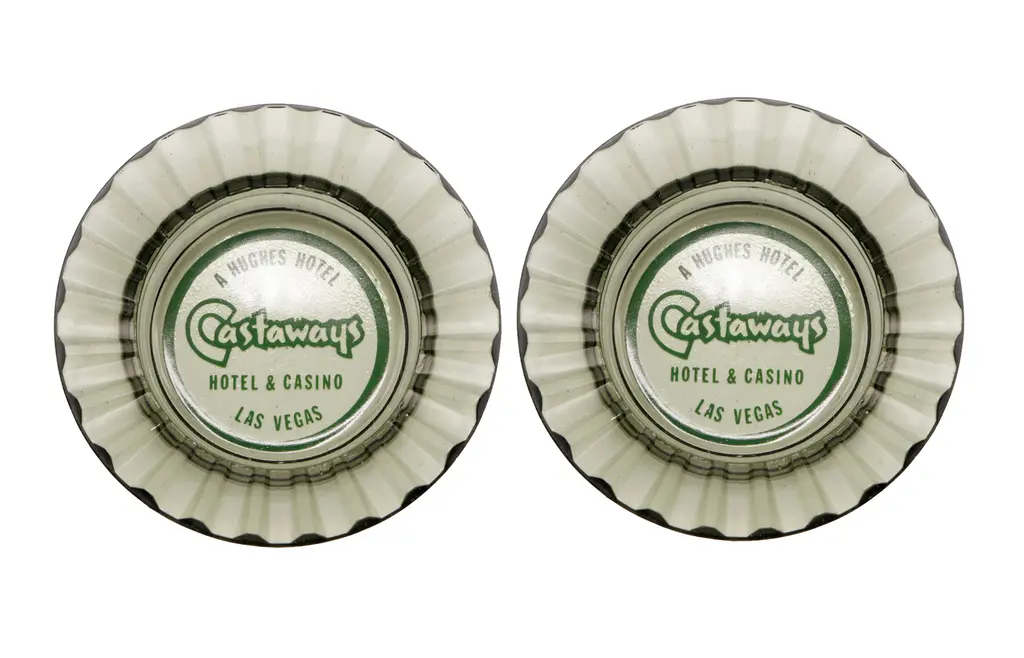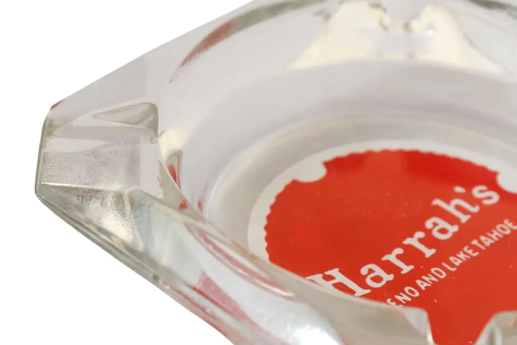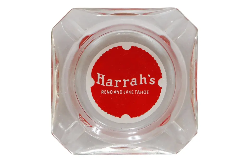 A square clear glass ashtray from the Harrah’s Hotel of Reno and Lake Tahoe, Nevada. Corners are cut, each with a cigarette rest. The center is printed with a red over white circle branded with their logo. Founded by William F. Harrah (1937��1978), known as Bill Harrah, opened a small bingo parlor in October 29, 1937, in Reno, Nevada. In 1955, he expanded to Stateline, Nevada, on the south shore of Lake Tahoe, where he would eventually open Harrah's Lake Tahoe.