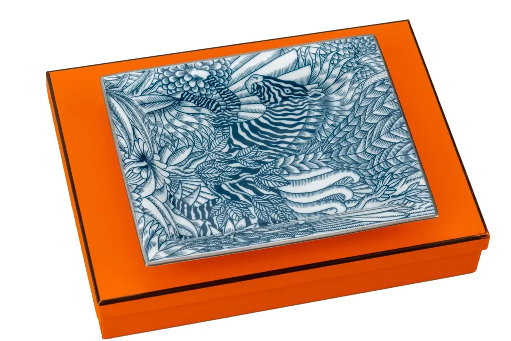 Hermès new blue and white porcelain ashtray with zebra design. Comes with original box.